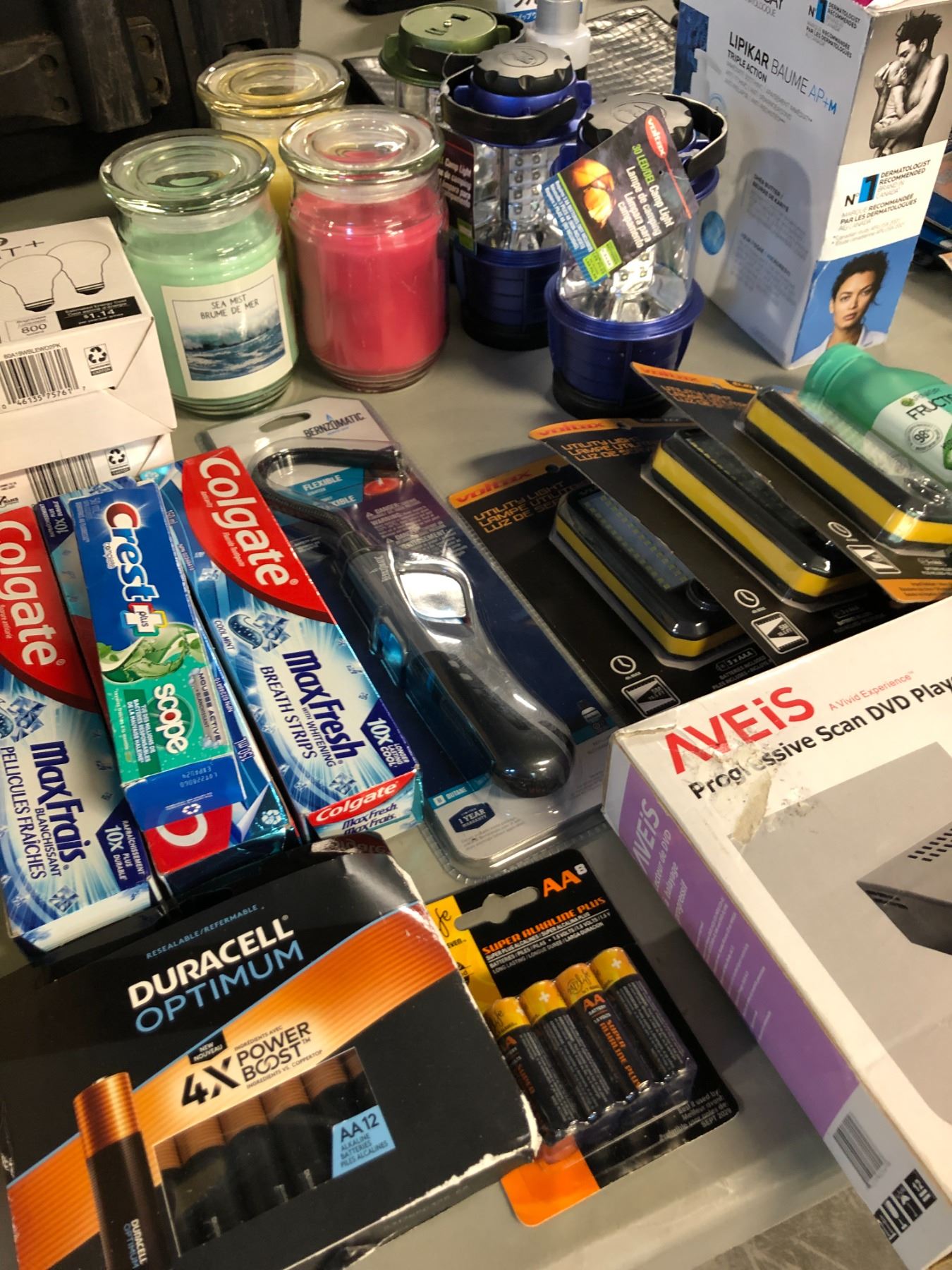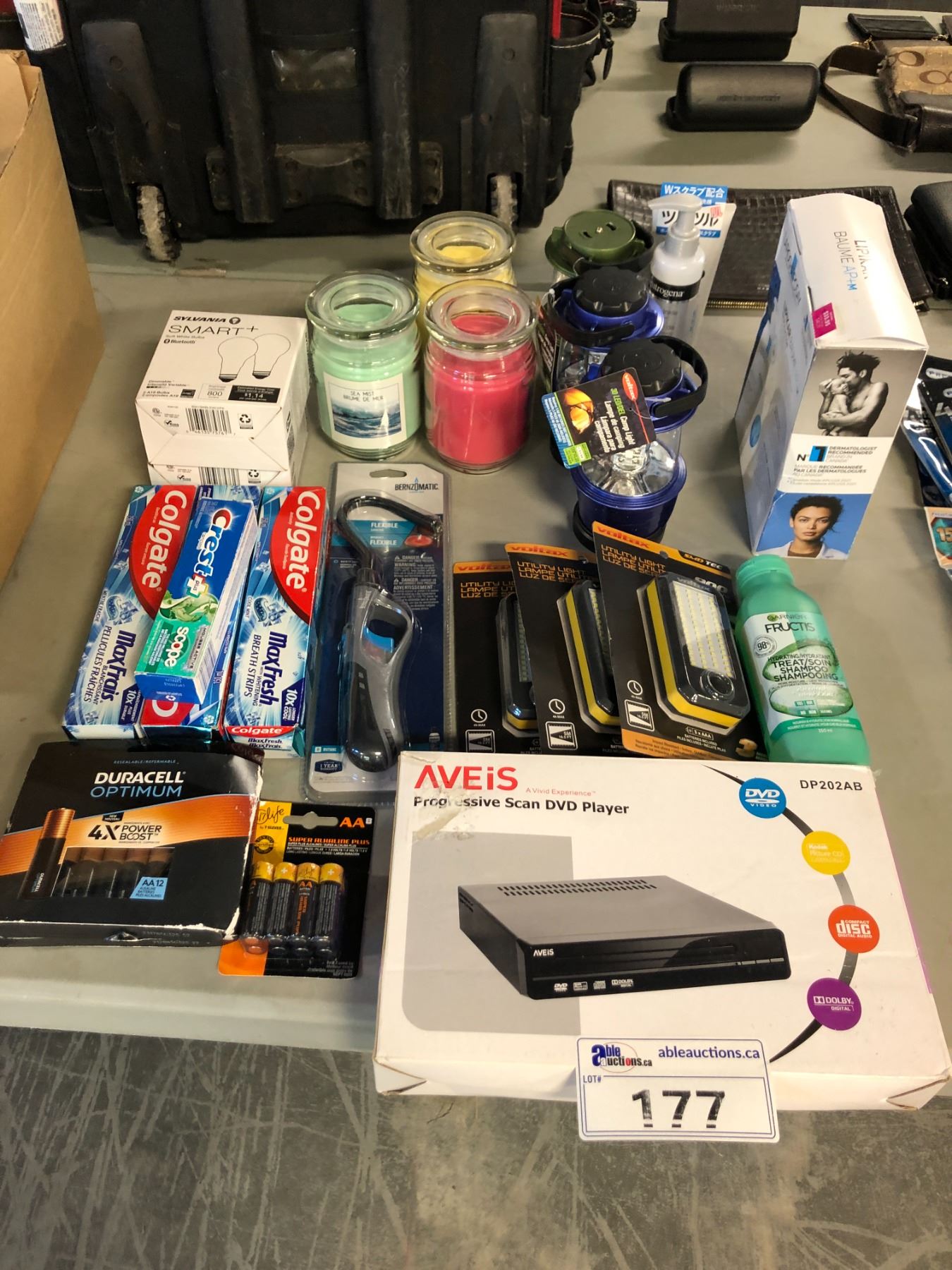 DURACELL OPTIMUM AA BATTERIES, 3 VOLTAX UTILITY LIGHTS, 3 VOLTAX PORTABLE CAMP LIGHTS, 3 ASSORTED CANDLES, SYLVANIA SMART SOFT WHITE BULBS, COLGATE TOOTHPASTE, BARBECUE LIGHTER AND AVIS DVD PLAYER