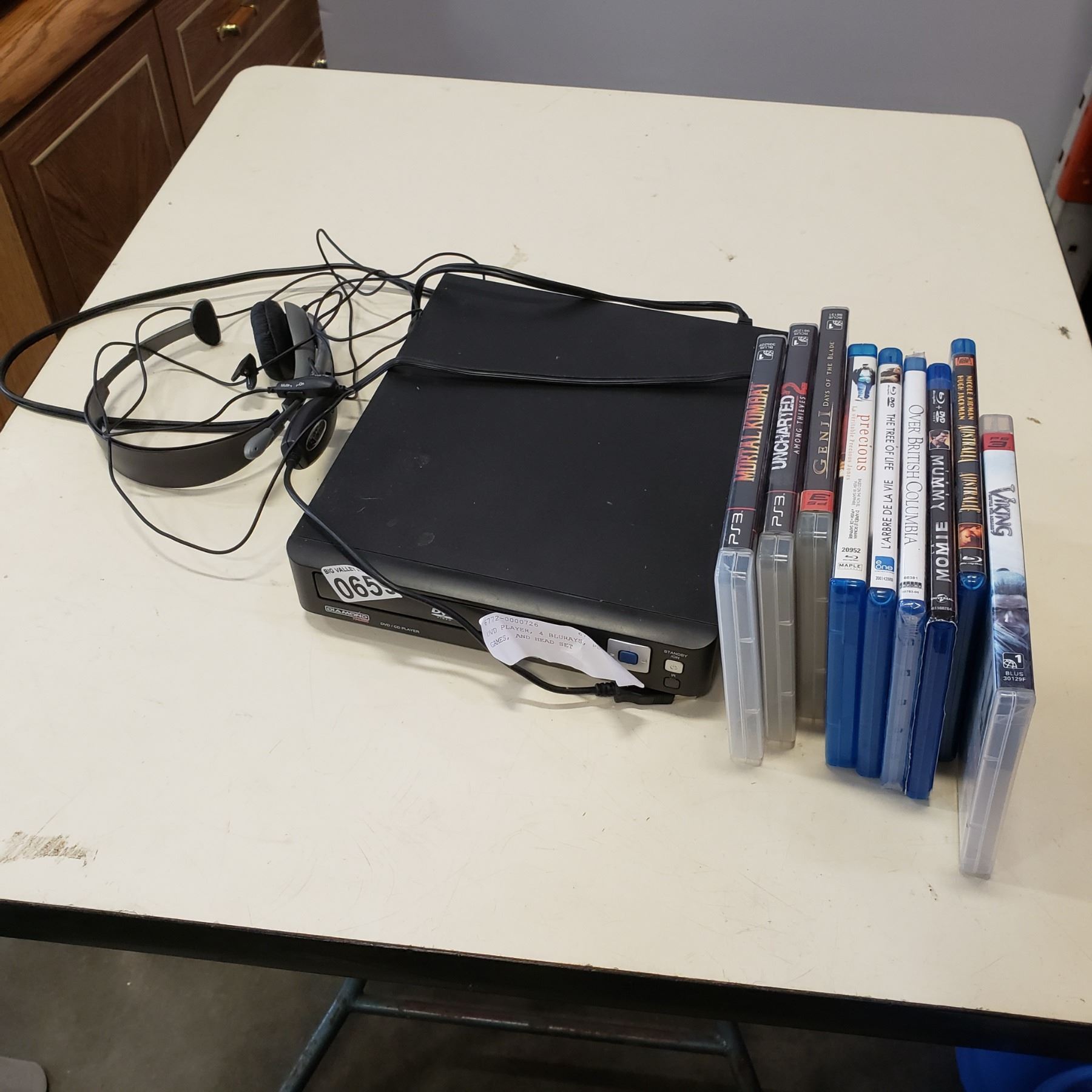 DVD PLAYER, 4 BLURAYS, PS3 GAMES, AND HEAD SET