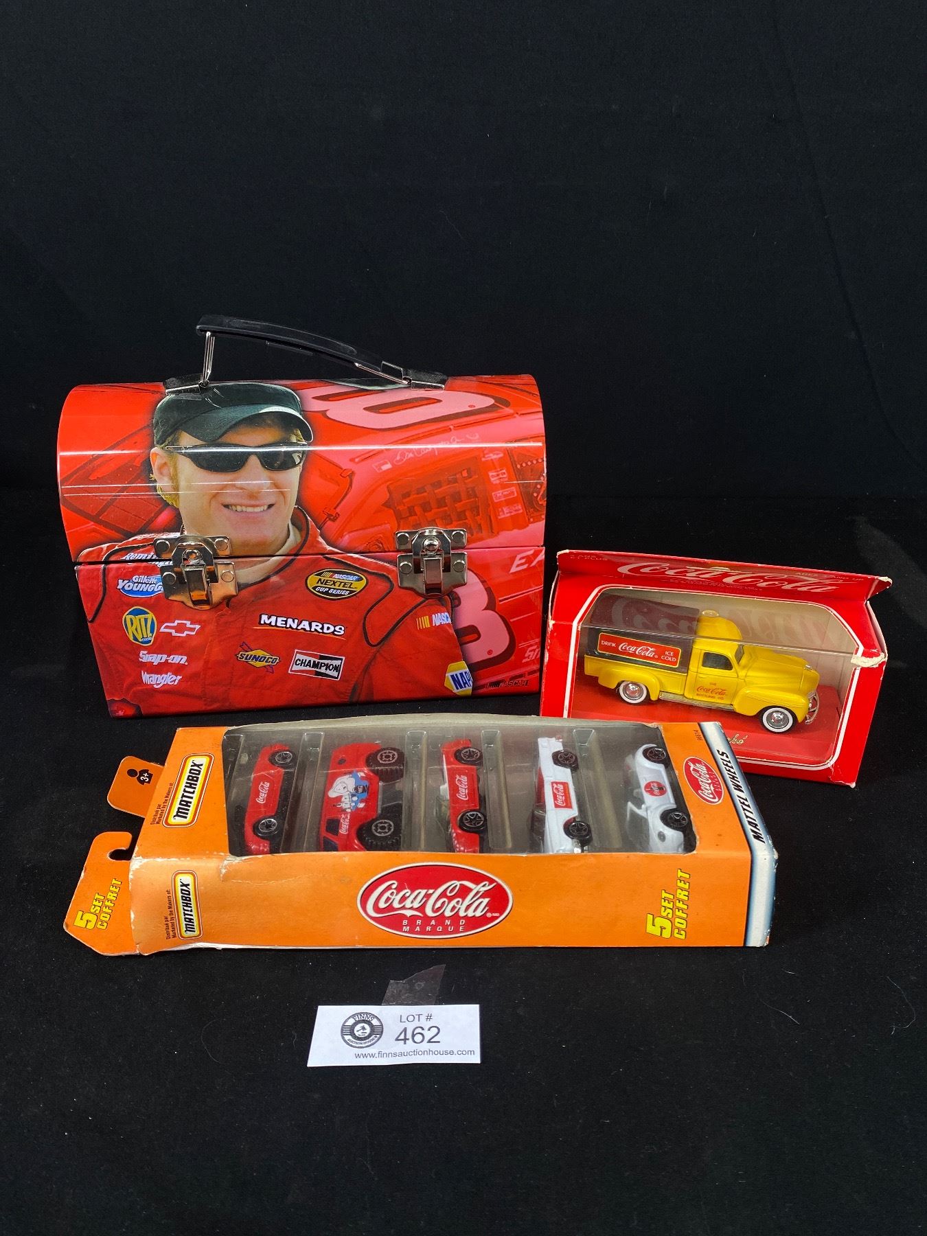 Dale Earnhart Metal Lunchbox + Coco Cola Matchbox Cars in Packages