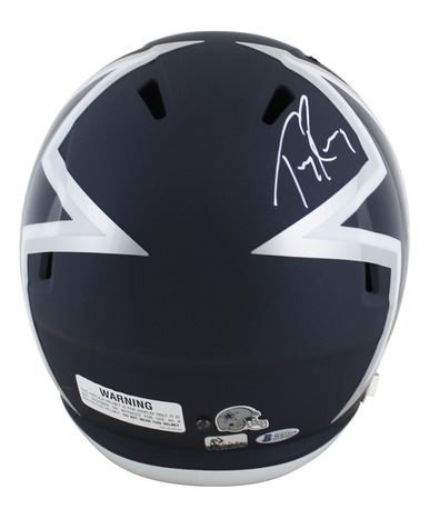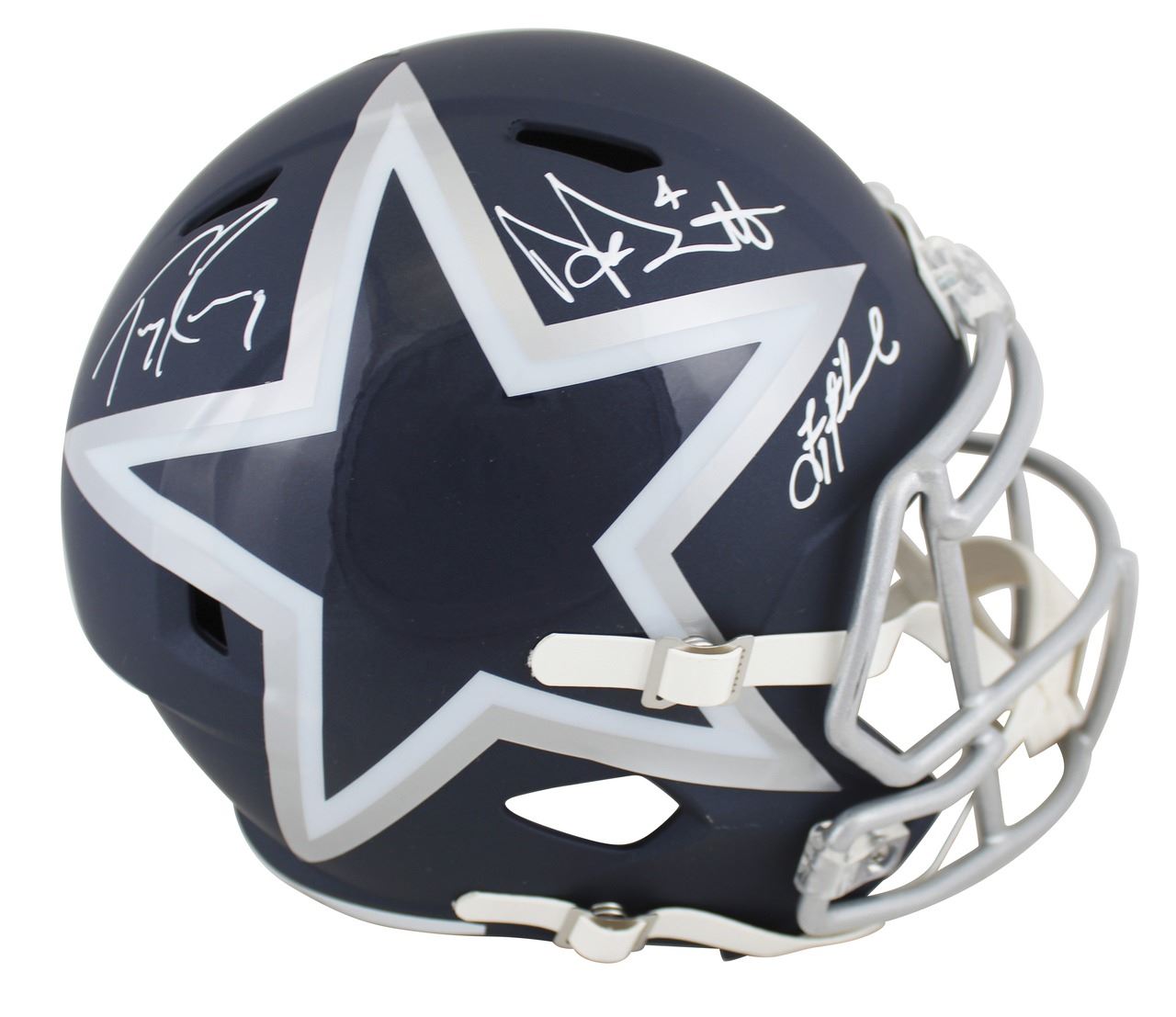 This Autographed Alternate Amp Riddell Full Size Speed Rep Helmet has been Personally Signed by Troy Aikman, Tony Romo & Dak Prescott of the Dallas Cowboys. This item is 100% Authentic to include a Certificate of Authenticity (COA) / hologram by Beckett Authentication Services. This is a BAS Witnessed Protection Program item which means a Beckett Authentication Service representative was present when this item was being signed.