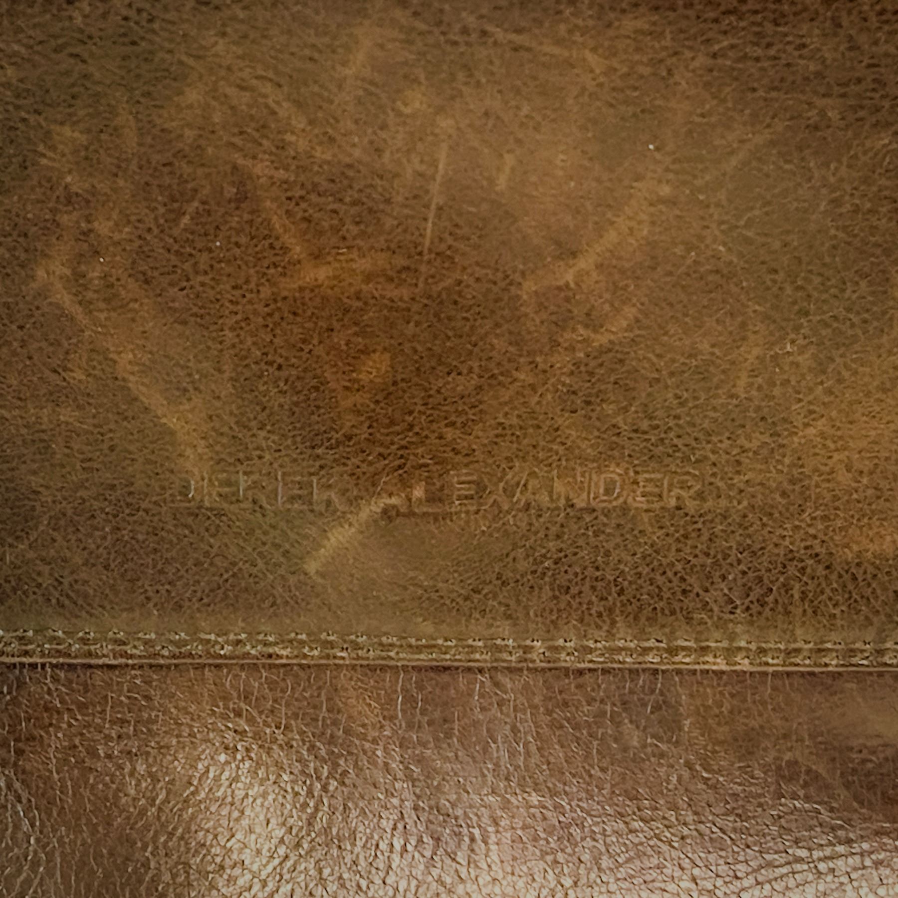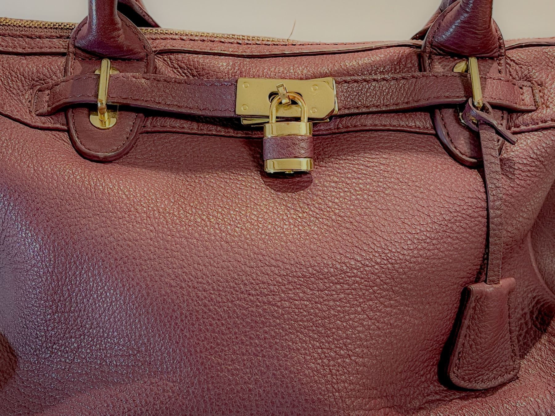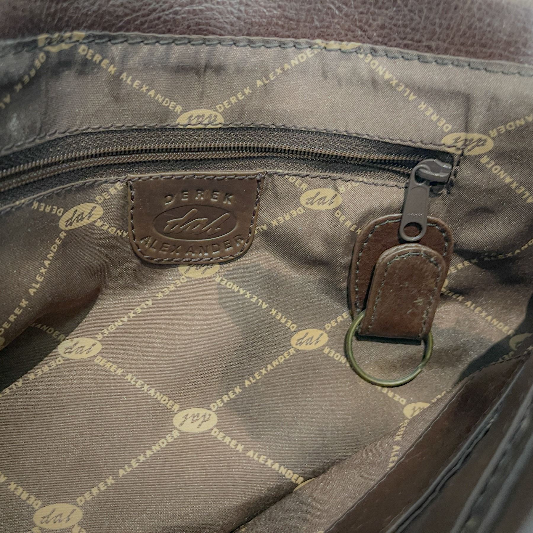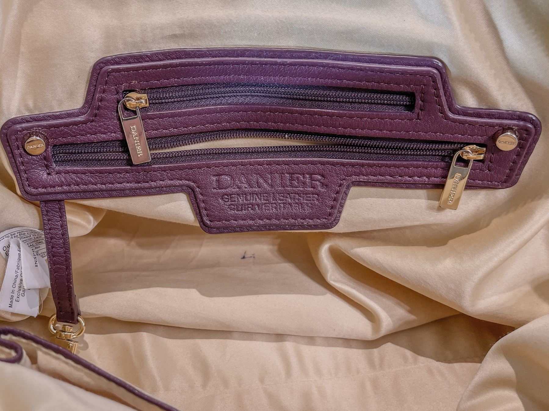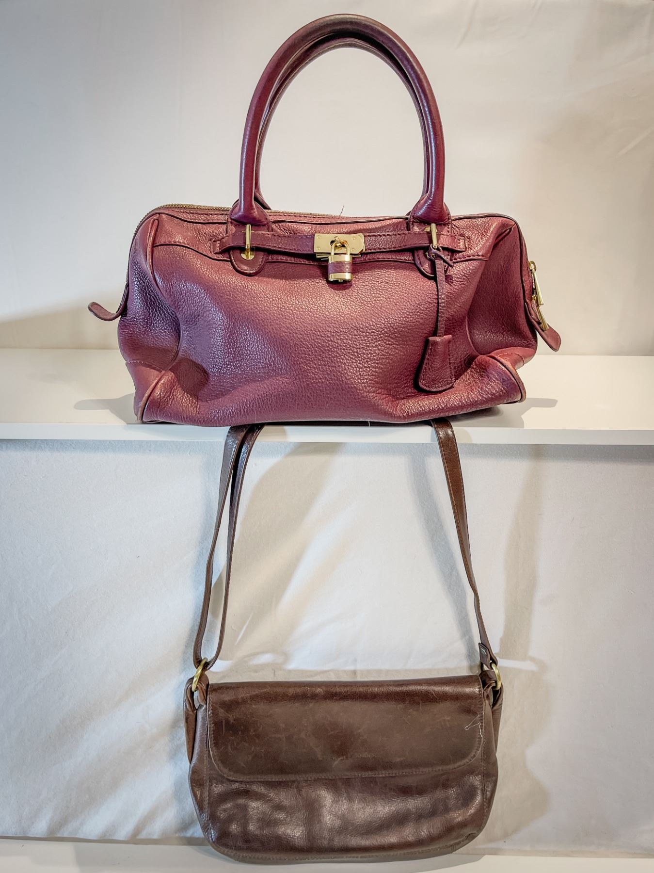 Two quality leather handbags — the plum-toned satchel is Danier Leather with gold hardware and lock detail; the brown crossbody is Derek Alexander, crafted from soft, full-grain leather. Both in good vintage condition with classic, timeless styling.