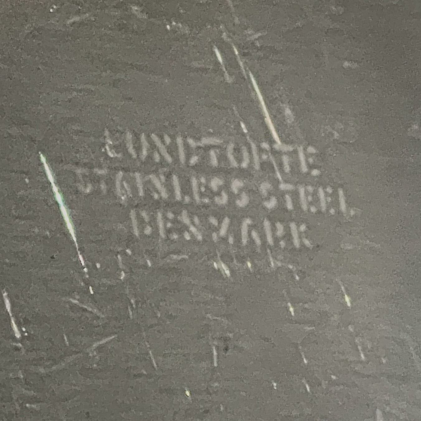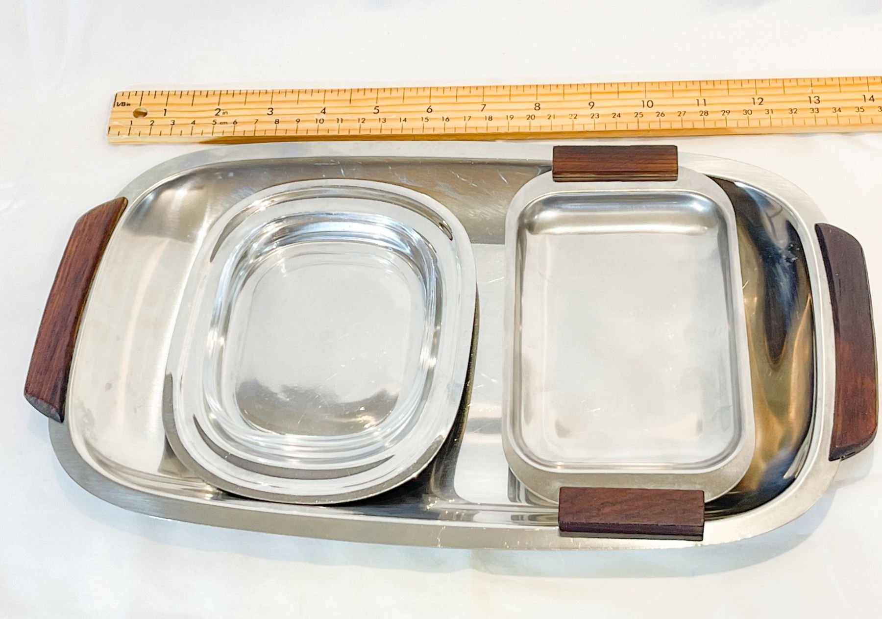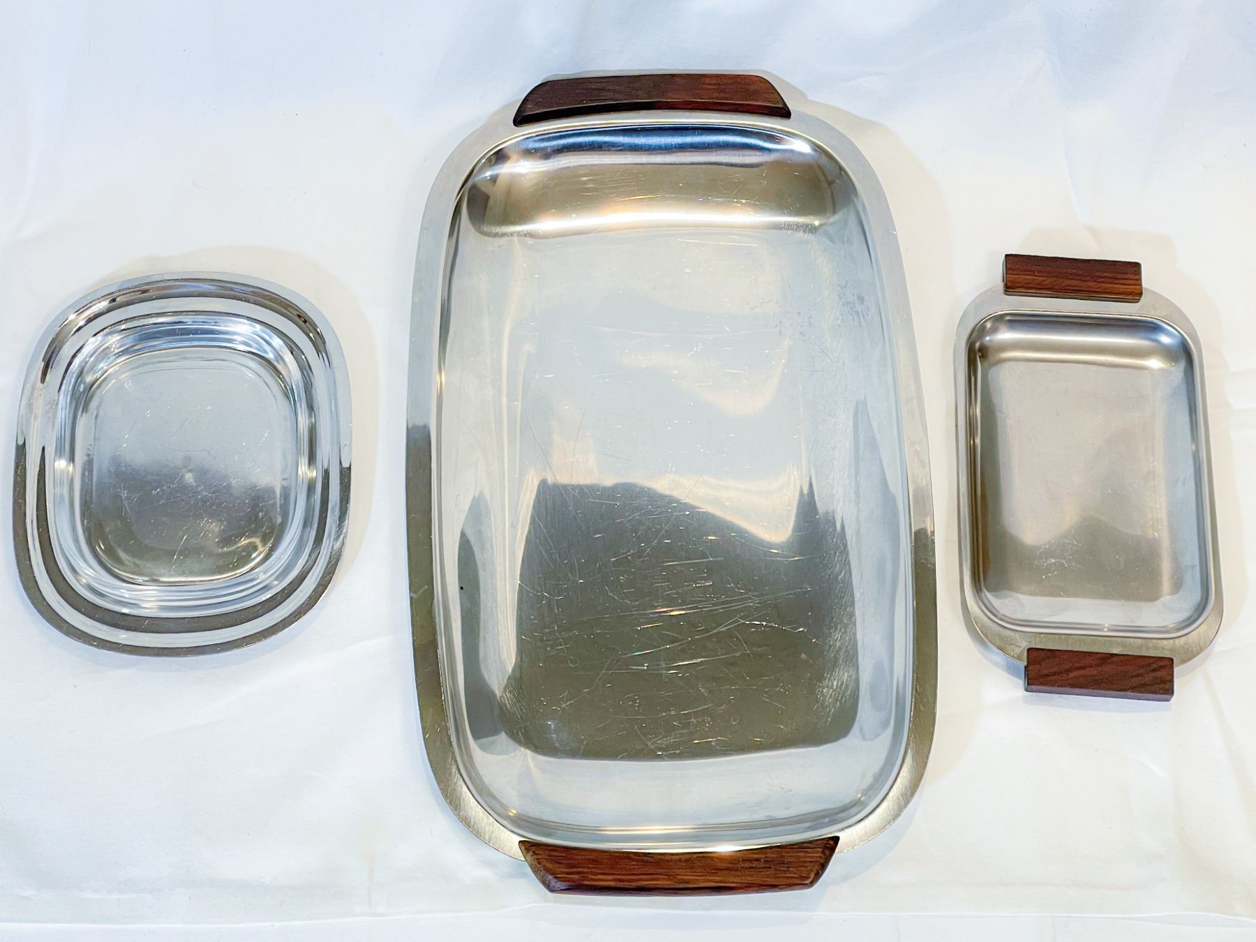 Beautiful set of three Danish mid-century modern stainless steel serving pieces. The largest platter (approx. 16") is signed Anni & Bent Tofte, Denmark. The other two pieces are unmarked but Danish in origin, one featuring teak handles and the other a fitted glass liner. Each has the clean sculptural lines typical of MCM Danish design. Light surface wear consistent with age, overall excellent vintage condition.