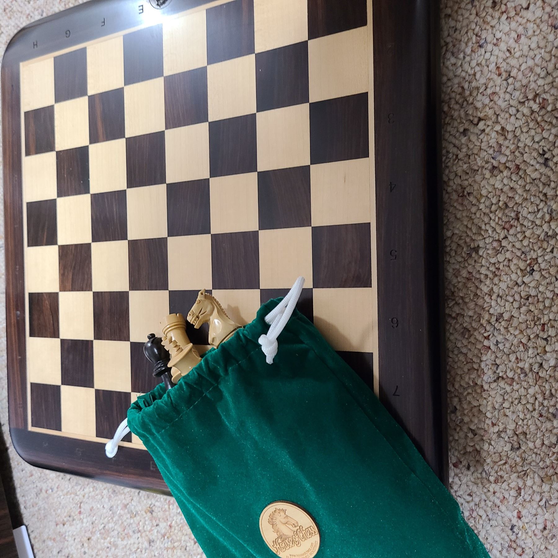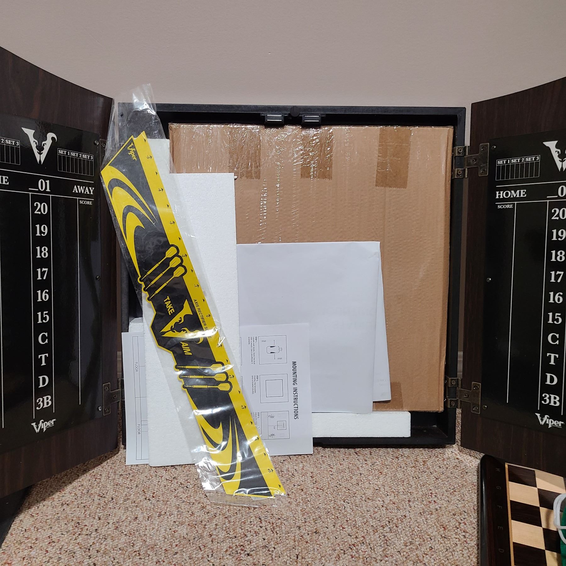 New dartboard in wood case, chess set. Pick up 9-10