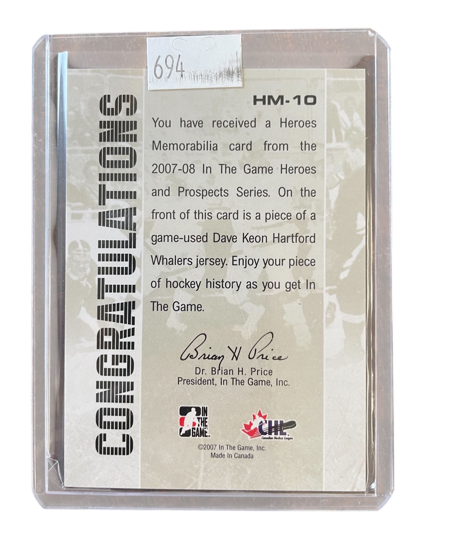 Dave Keon Hartford 2007 Game-Used Jersey Patch Hockey Card
