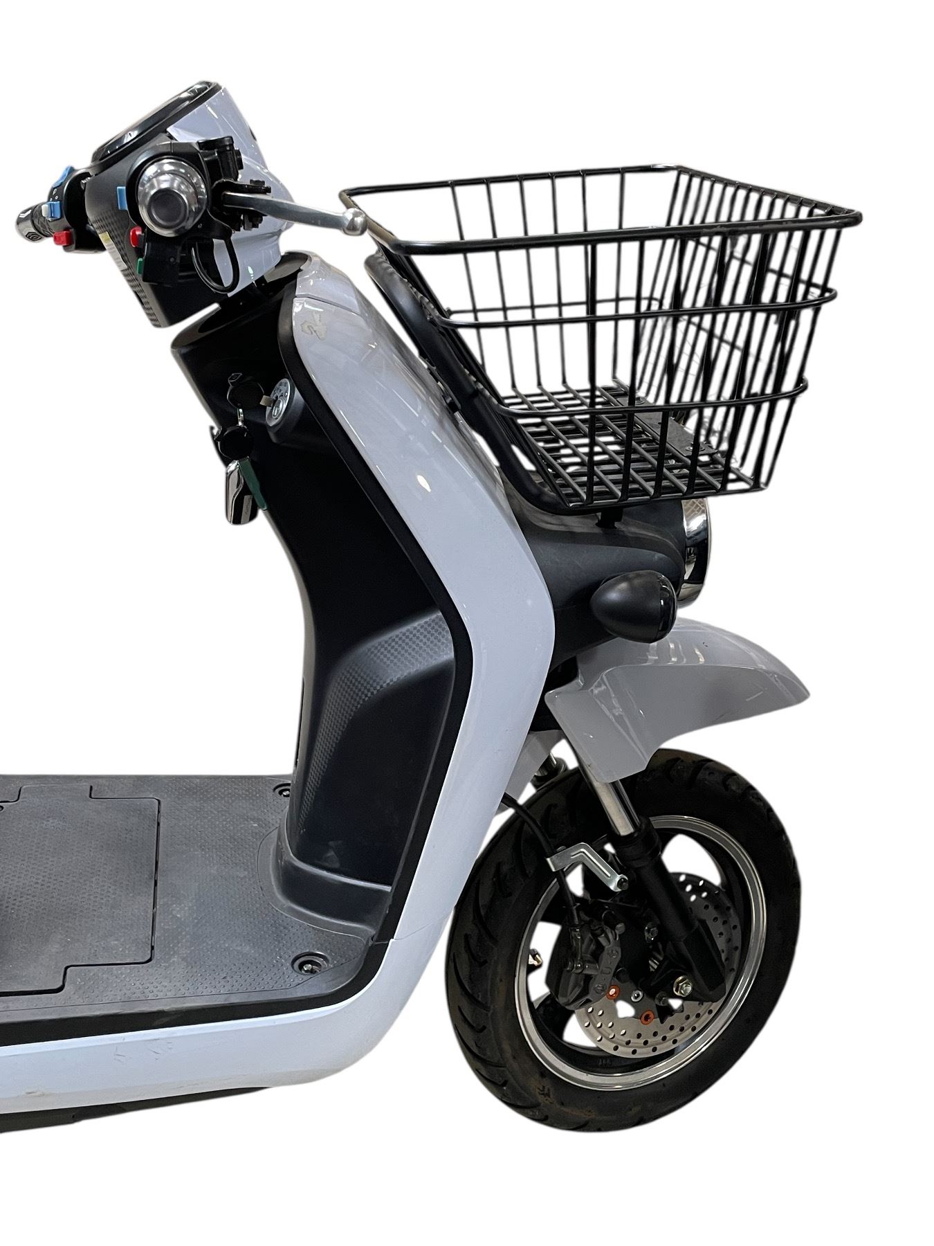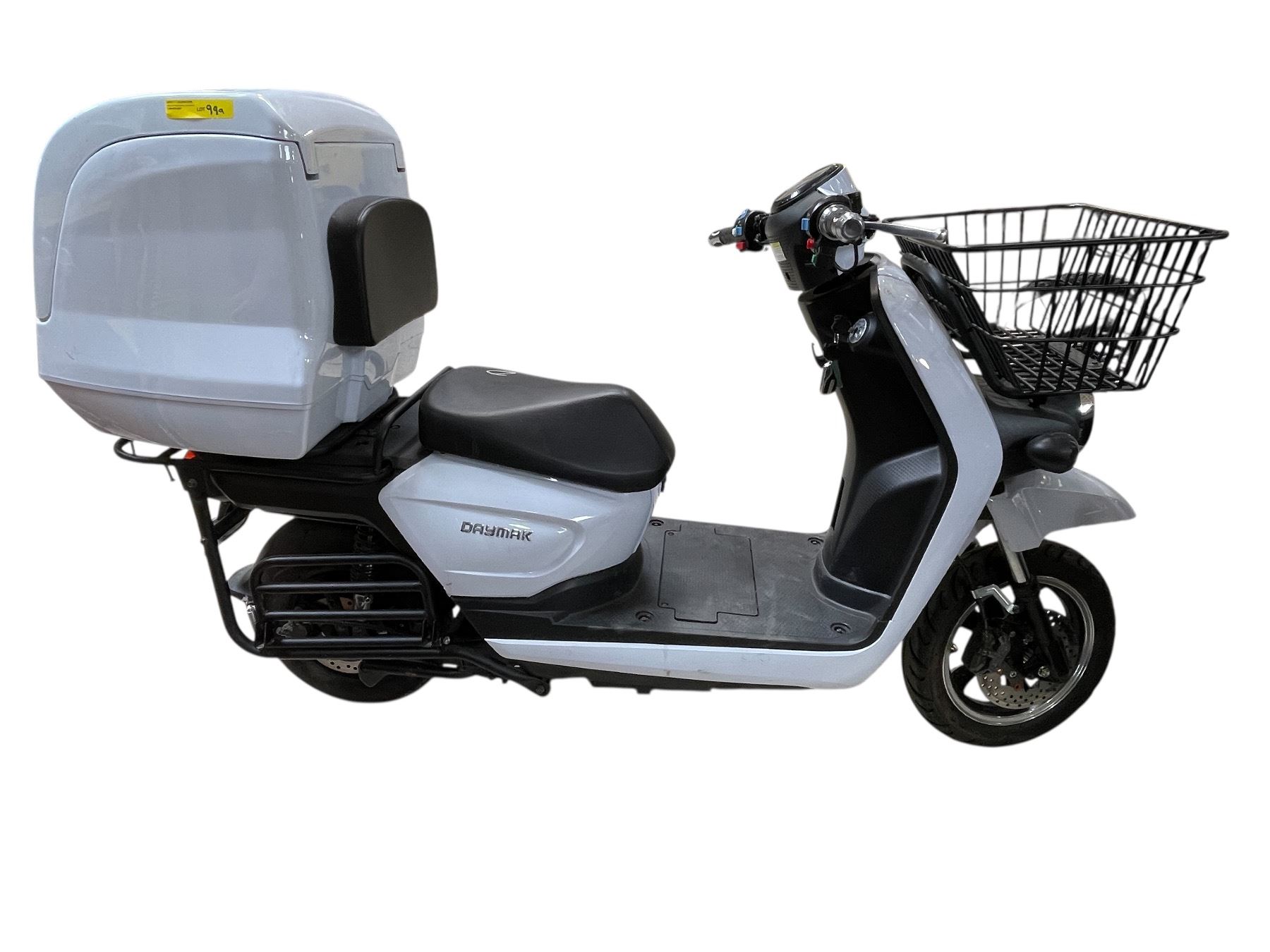 Daymak Electric Scooter with Cargo Box & Front Basket Sleek Daymak e-scooter featuring rear cargo box, front utility basket, and digital display. Ideal for delivery or personal commuting.