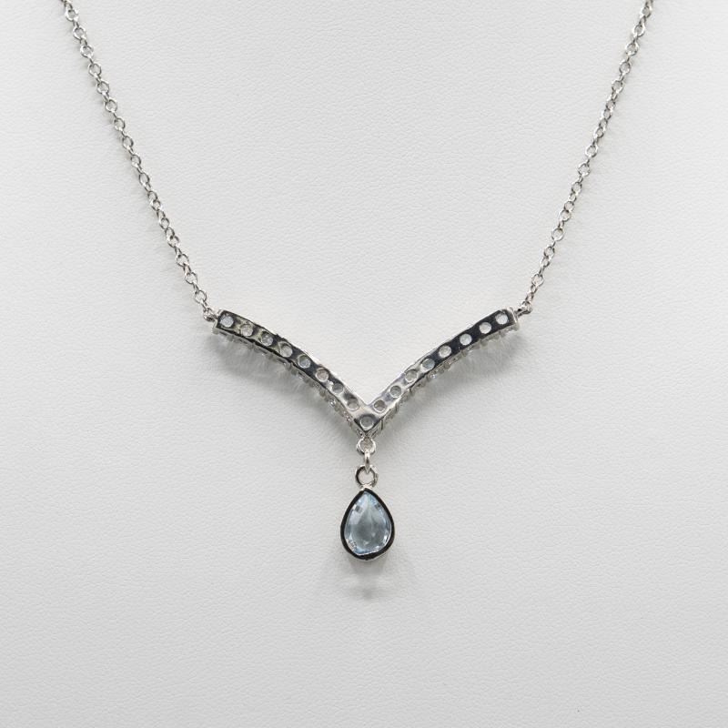 This Necklace Features A Natural Pear Cut 9 x 6 mm Pear Cut Sky Blue Topaz.It Is Surrounded By 9 Genuine 3mm Round Cut Blue Topaz And 8 Genuine 3mm Eye Clean WhiteTopaz. All Gems Are Mounted In Rhodium Overlay Which Is Part Of The Platinum Family For The Extra Shine And Brilliance.32.5 Cttw or Approx 6.5 Total Gram Weight.The length is 18 ".This Necklace is Stunning !