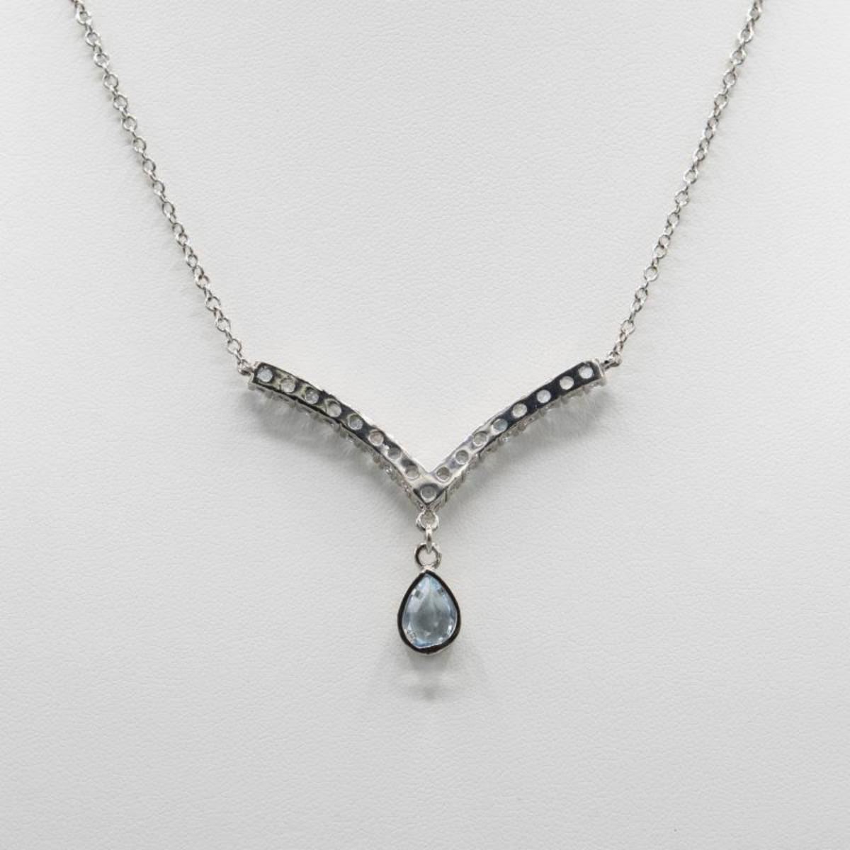 This Necklace Features A Natural Pear Cut 9 x 6 mm Pear Cut Sky Blue Topaz.It Is Surrounded By 9 Genuine 3mm Round Cut Blue Topaz And 8 Genuine 3mm Eye Clean WhiteTopaz. All Gems Are Mounted In Rhodium Overlay Which Is Part Of The Platinum Family For The Extra Shine And Brilliance.32.5 Cttw or Approx 6.5 Total Gram Weight.The length is 18 ".This Necklace is Stunning !
