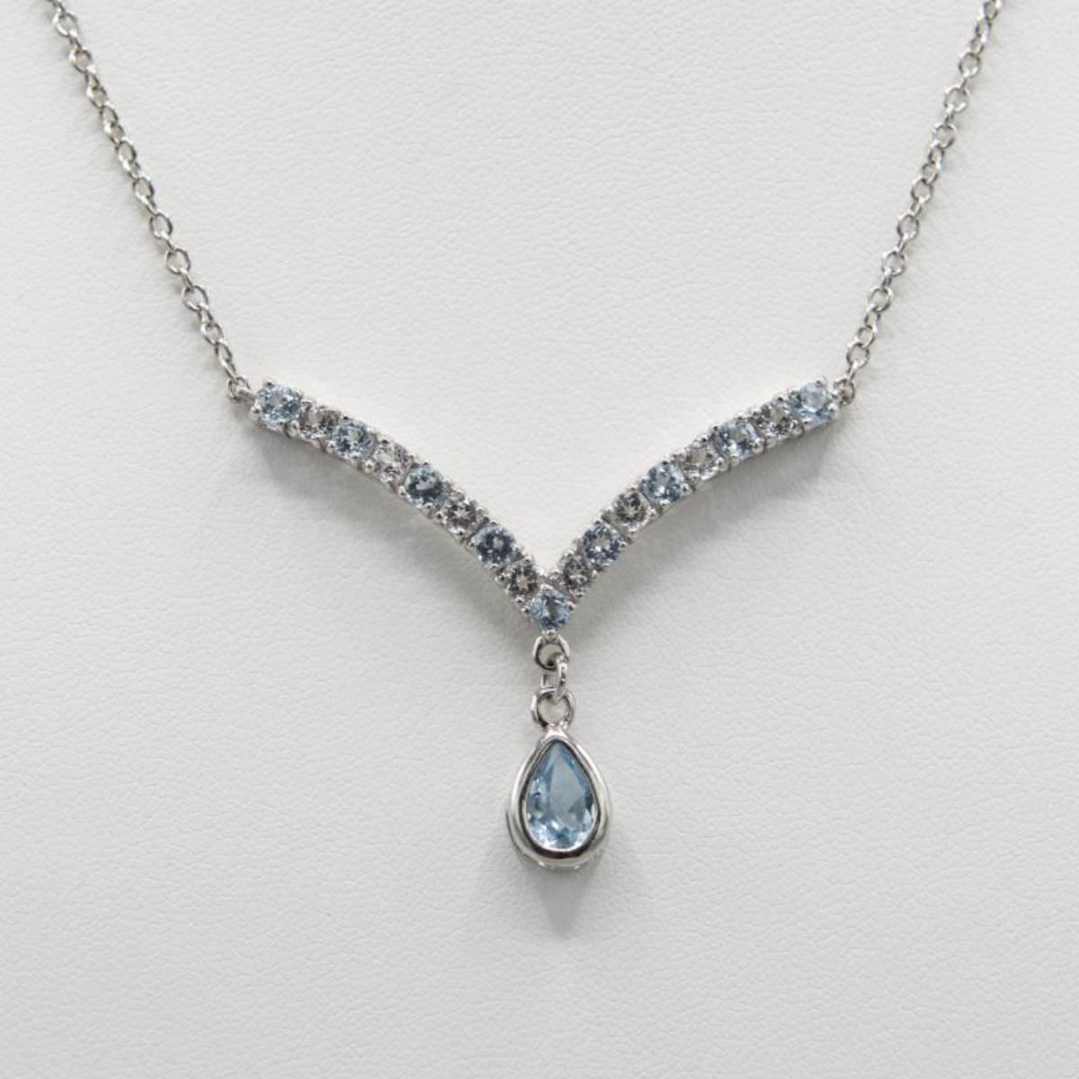 This Necklace Features A Natural Pear Cut 9 x 6 mm Pear Cut Sky Blue Topaz.It Is Surrounded By 9 Genuine 3mm Round Cut Blue Topaz And 8 Genuine 3mm Eye Clean WhiteTopaz. All Gems Are Mounted In Rhodium Overlay Which Is Part Of The Platinum Family For The Extra Shine And Brilliance.32.5 Cttw or Approx 6.5 Total Gram Weight.The length is 18 ".This Necklace is Stunning !