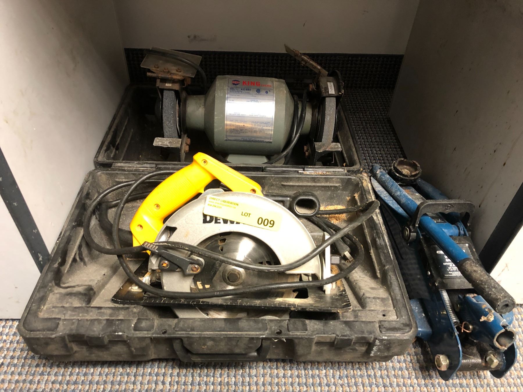 DeWalt circular saw w/ bench grinder & 2 ton trolley jack