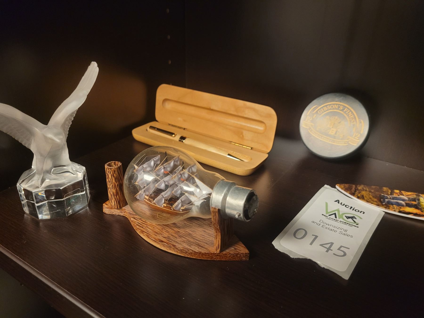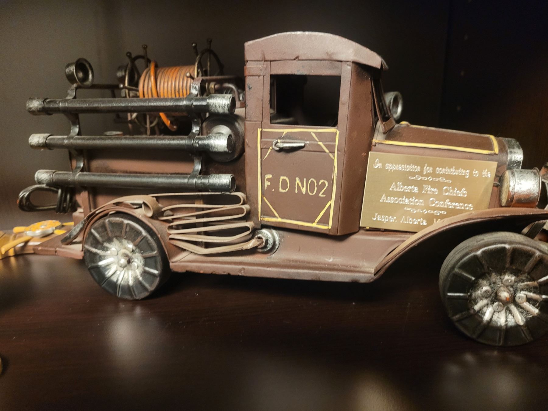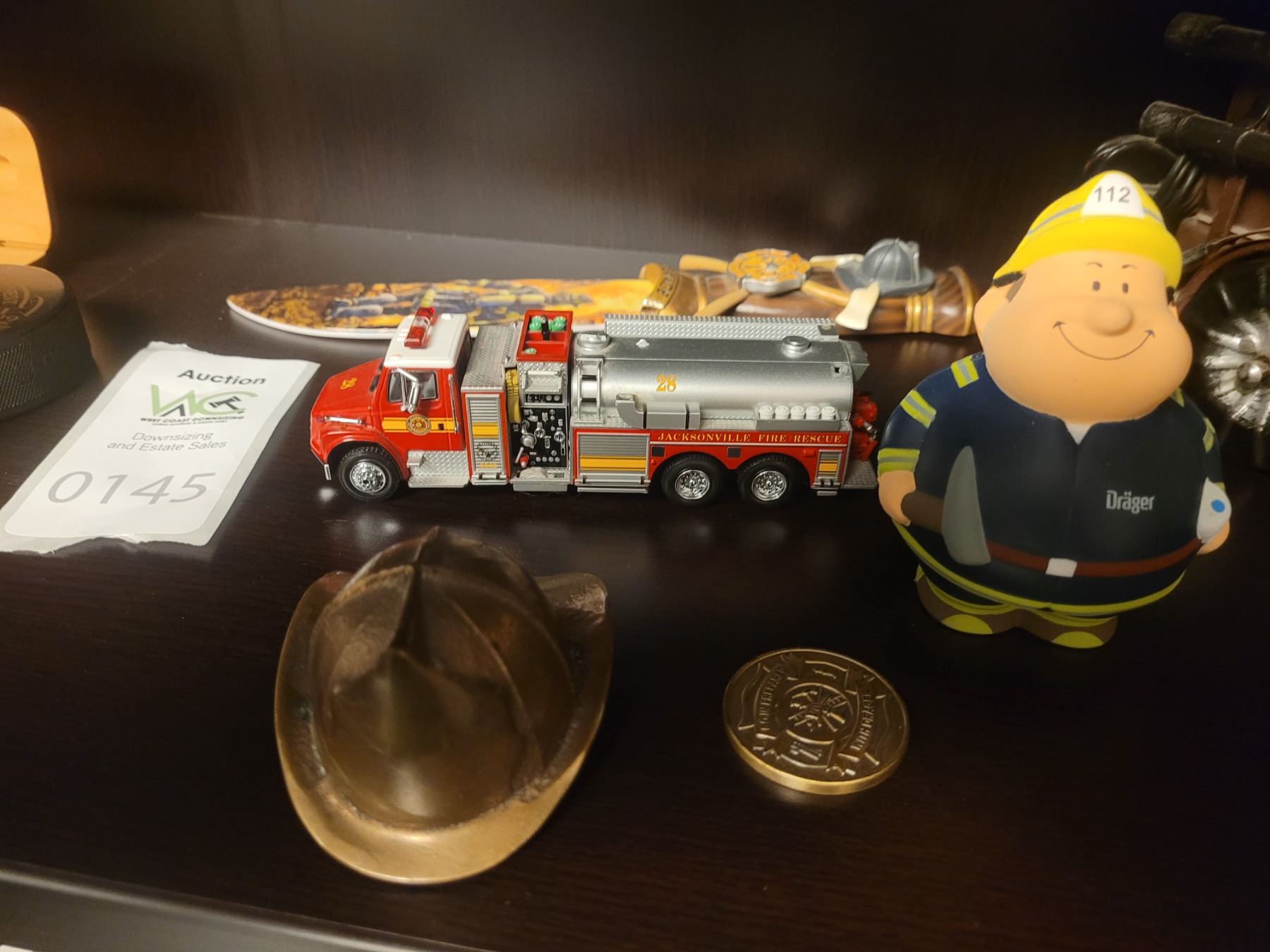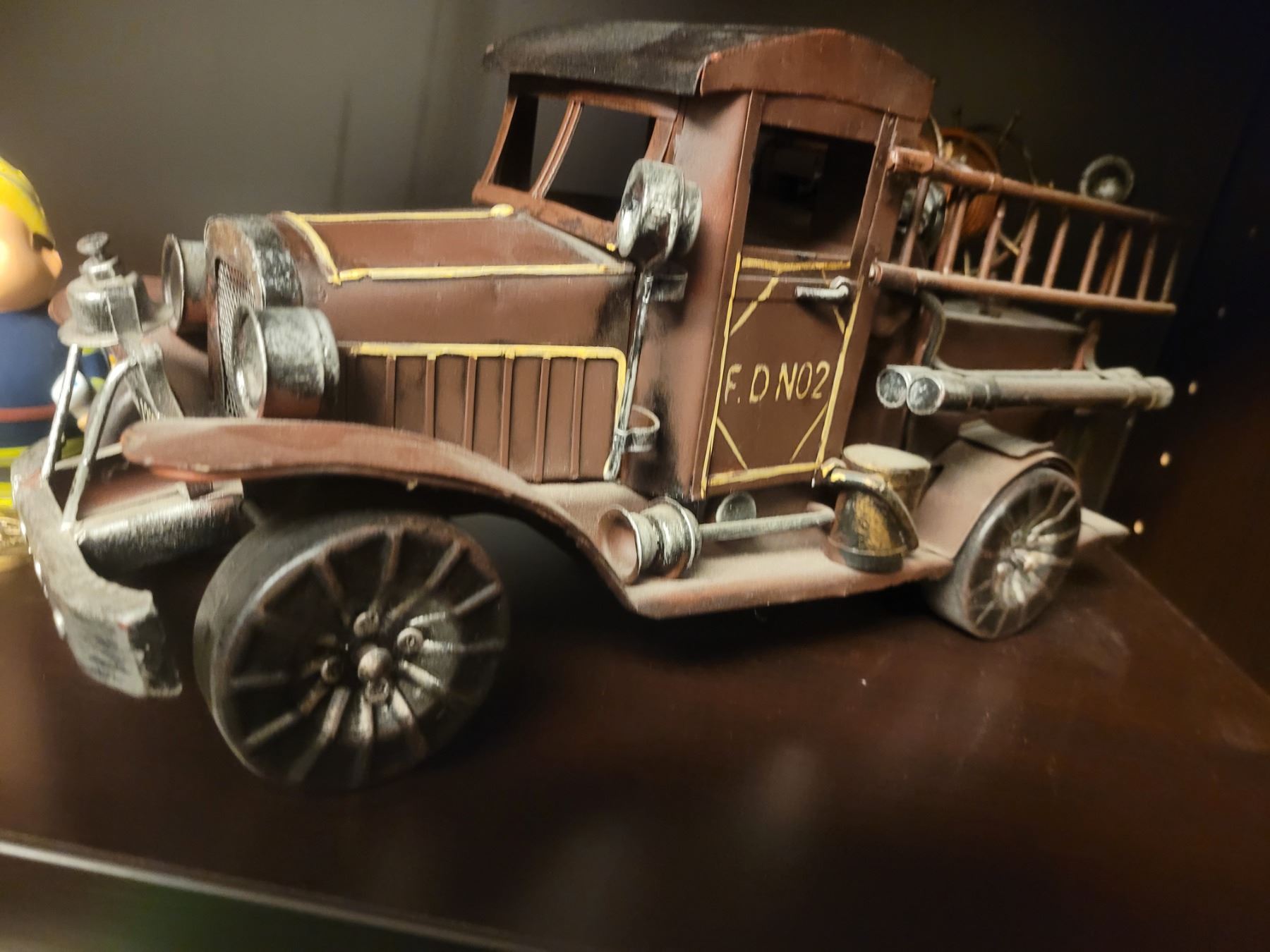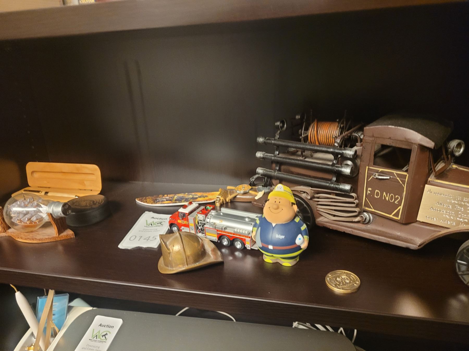 Old fire truck, firefighter decor, wood pen, ship in a bottle, more. Pick up 9-10