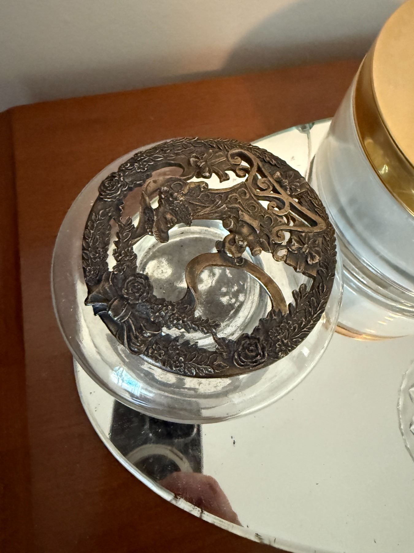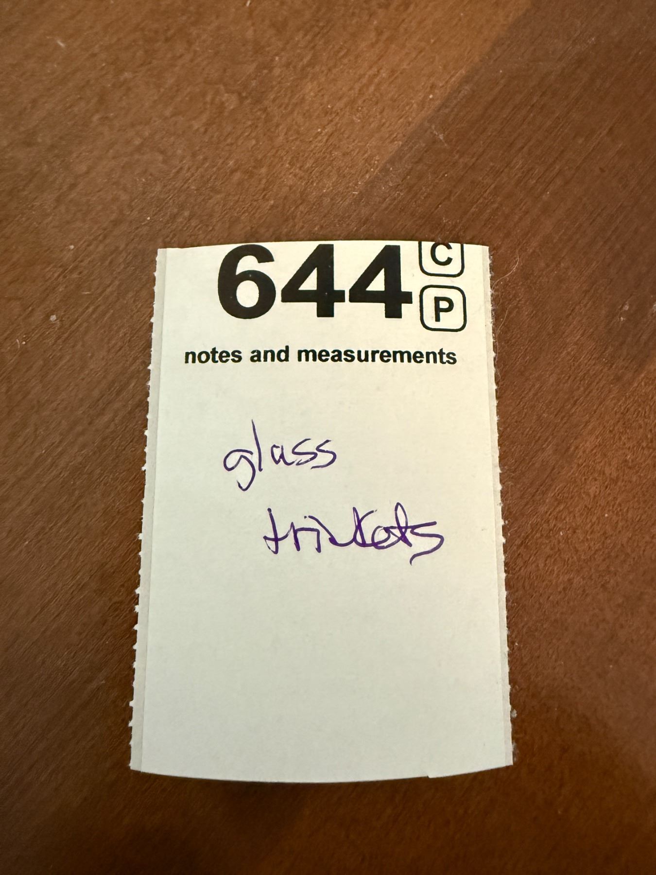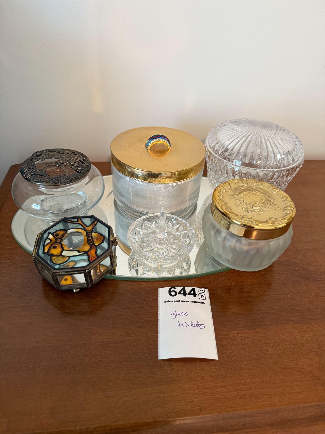 Trinket boxes and decorative storage jars. Mirror optional (cracked). In bedroom 2.