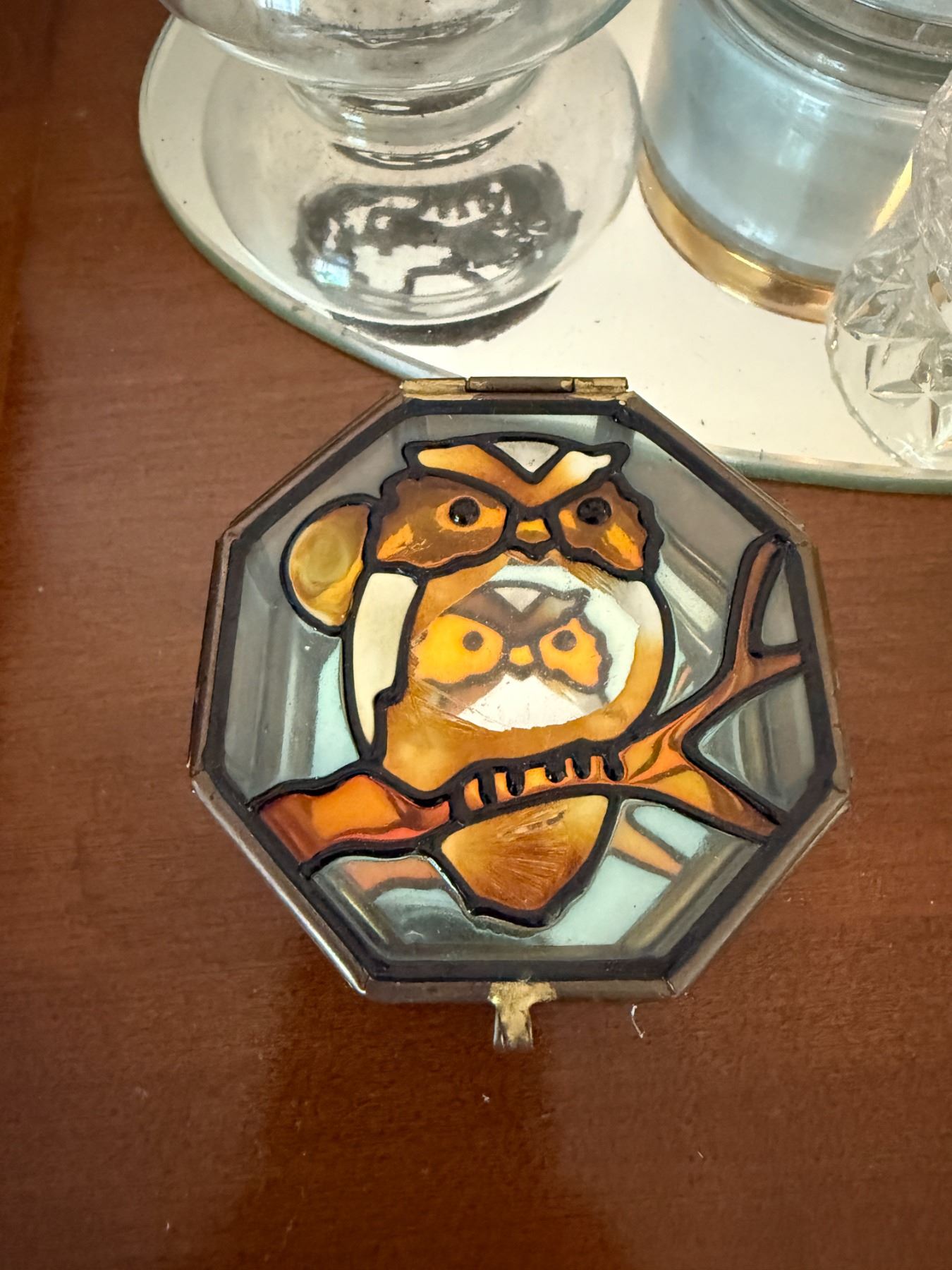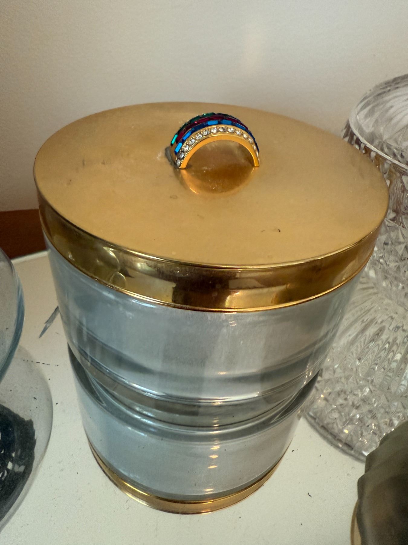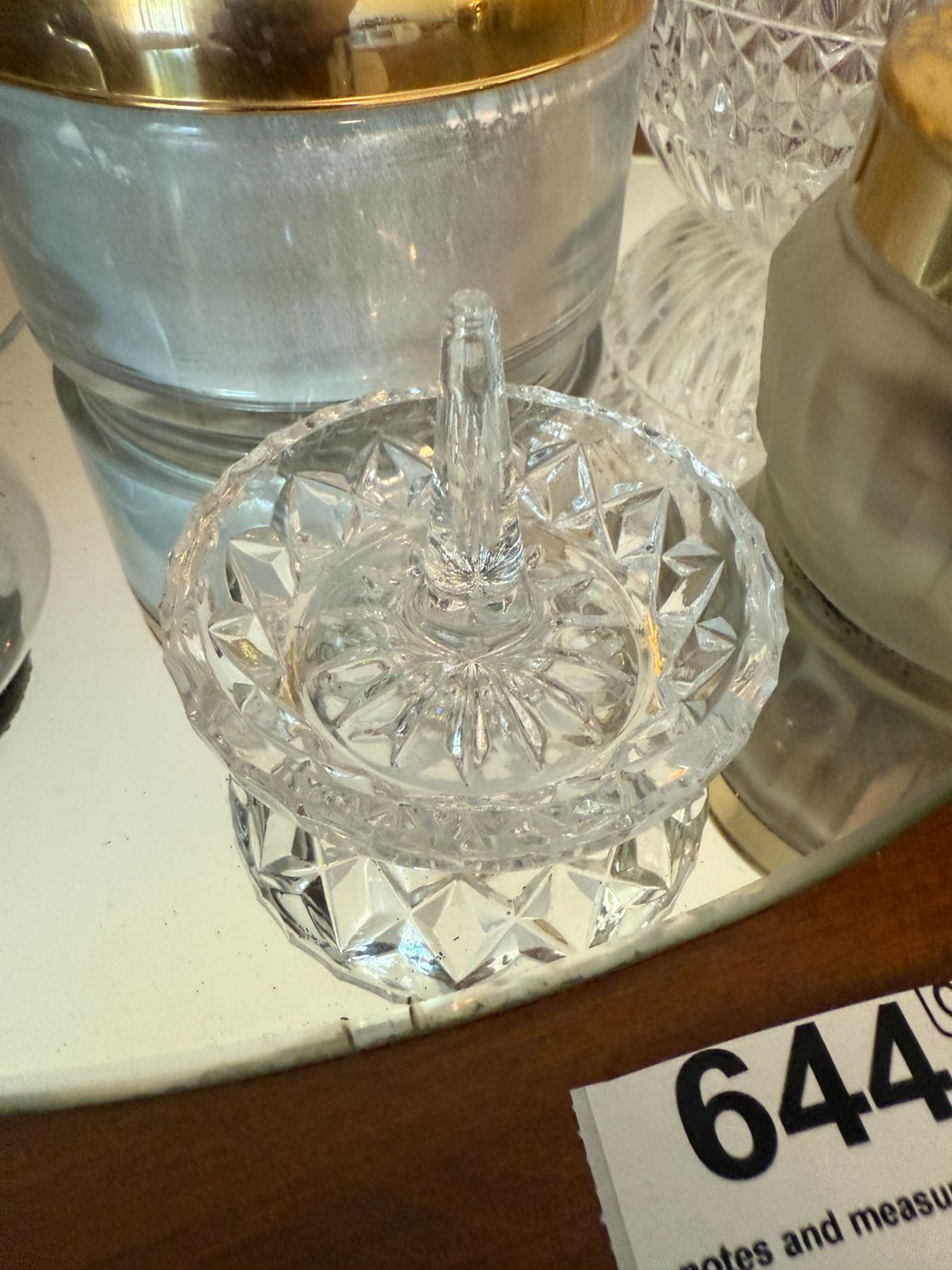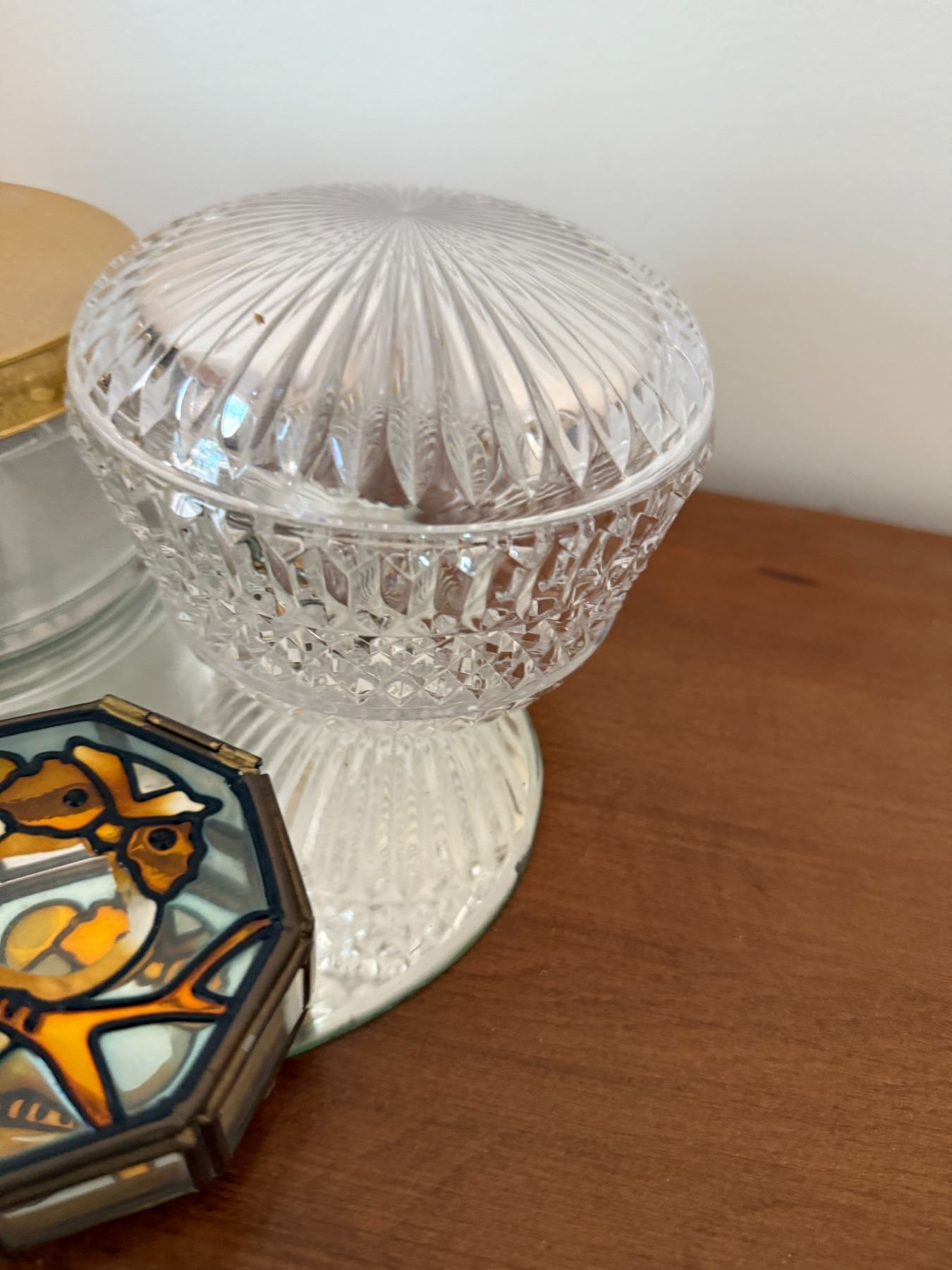 Trinket boxes and decorative storage jars. Mirror optional (cracked). In bedroom 2.