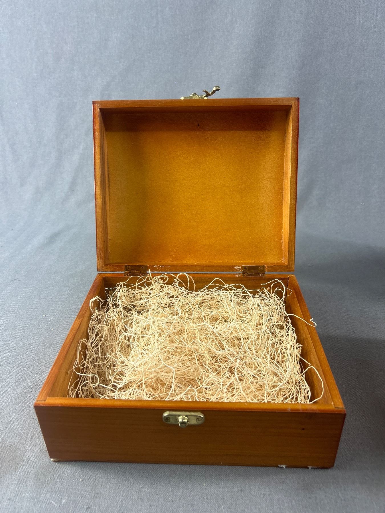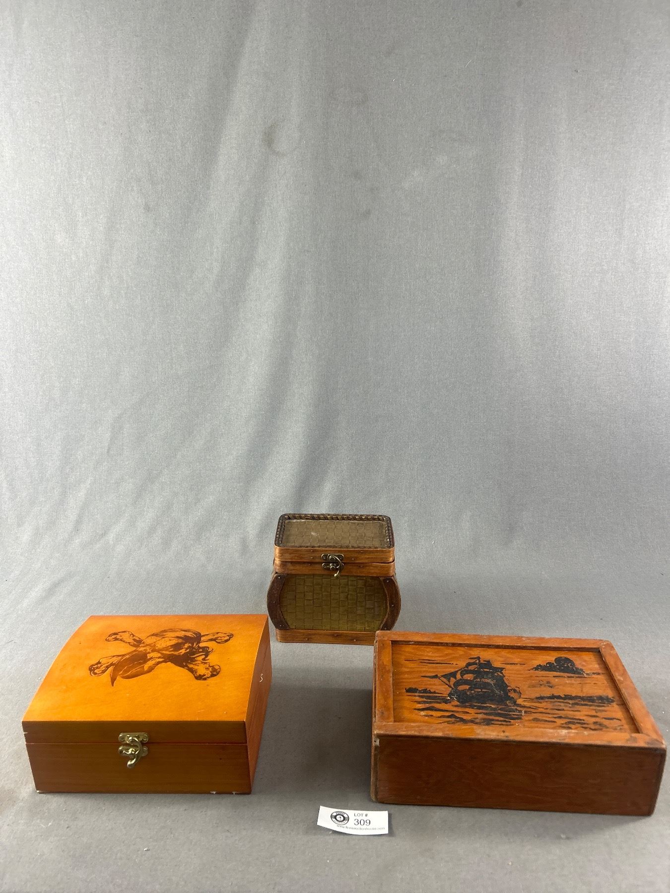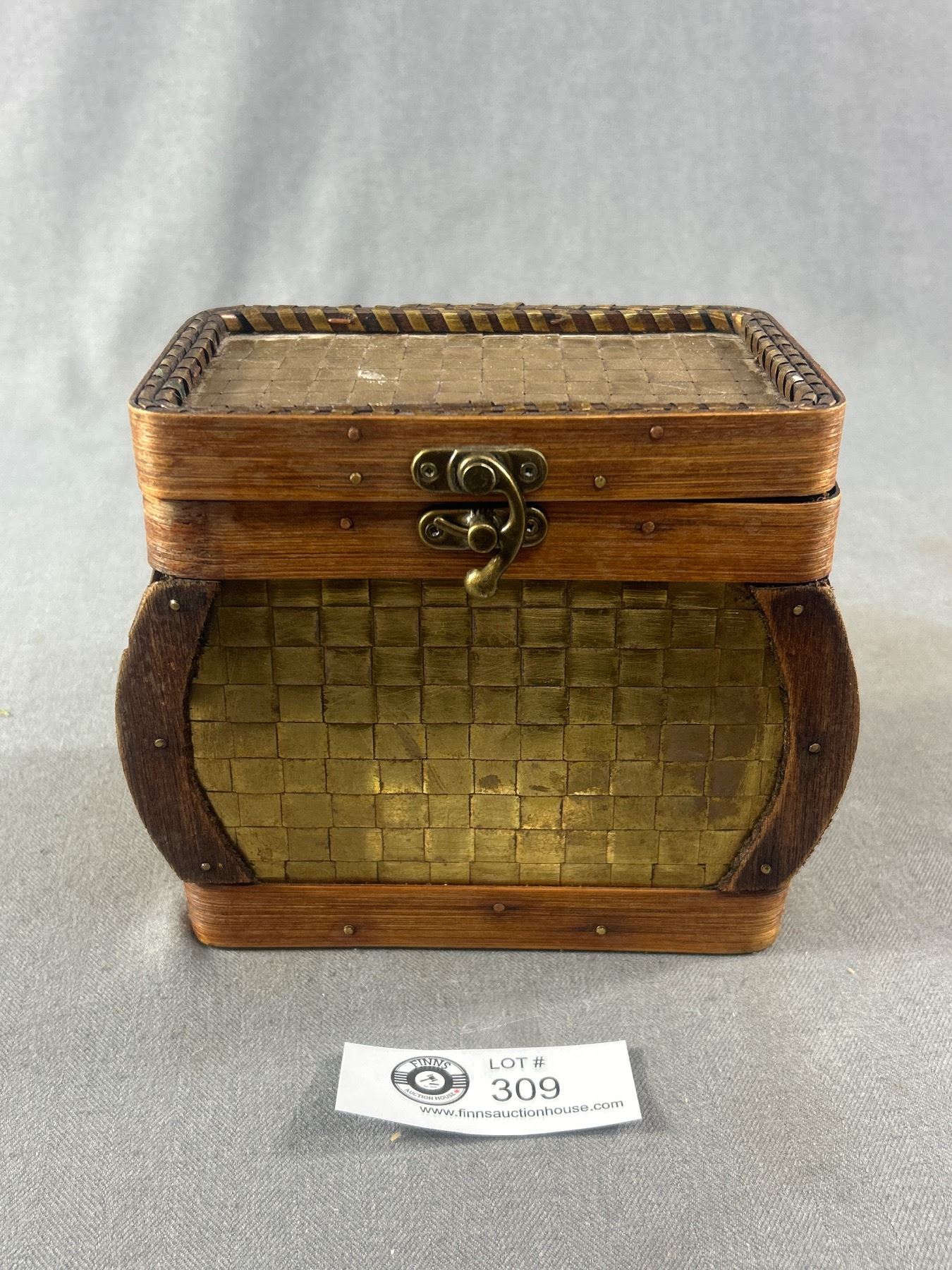 Decorative Trinket Box w/ Latch Approx. 5.5" H x 7" x 4" & 2 Wood Storage Boxes. Approx. 10" x 6.5" x 3" & 7" x 8.5" X 3.5"