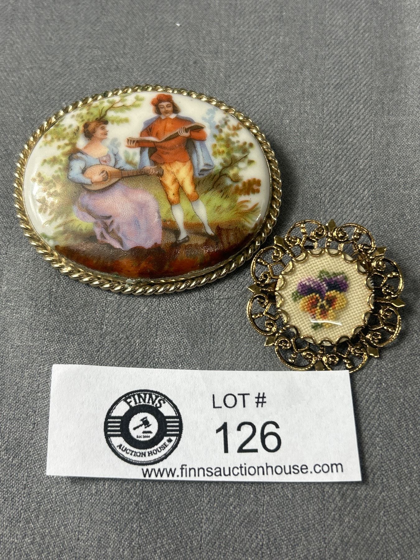 Delicate Vintage Petit Point Brooch and Hand Painted Porcelain Coro Brooch