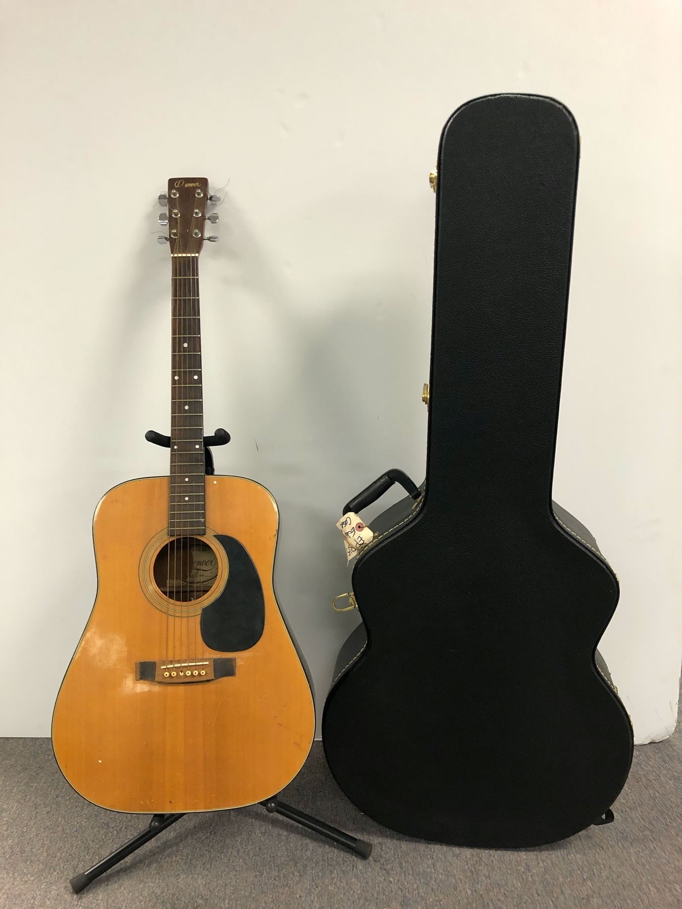 Denver 6 string acoustic guitar w/ hard case - neck chipped (FLOOR STAND NOT INCLUDED)