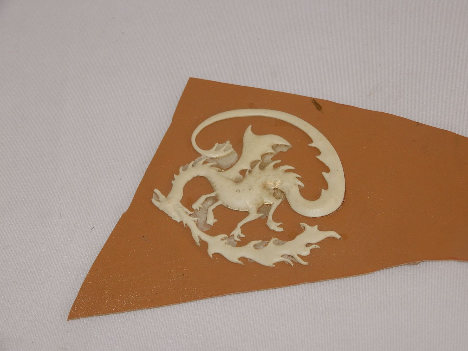 "Descendants" - Production made unpainted Descendants detail from the leather spell book, leather sample from book included THIS LOT IS LOCATED AT 2306 MADISON AVE, BURNABY.
