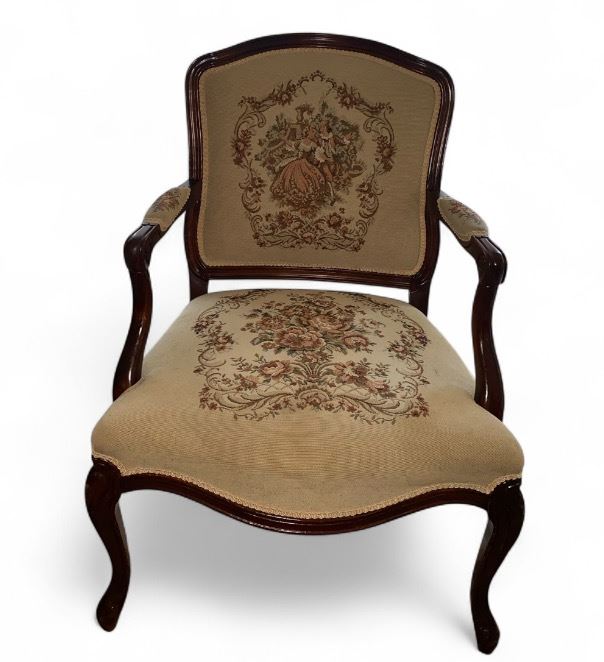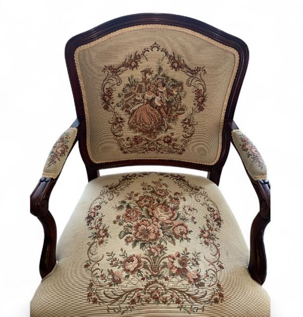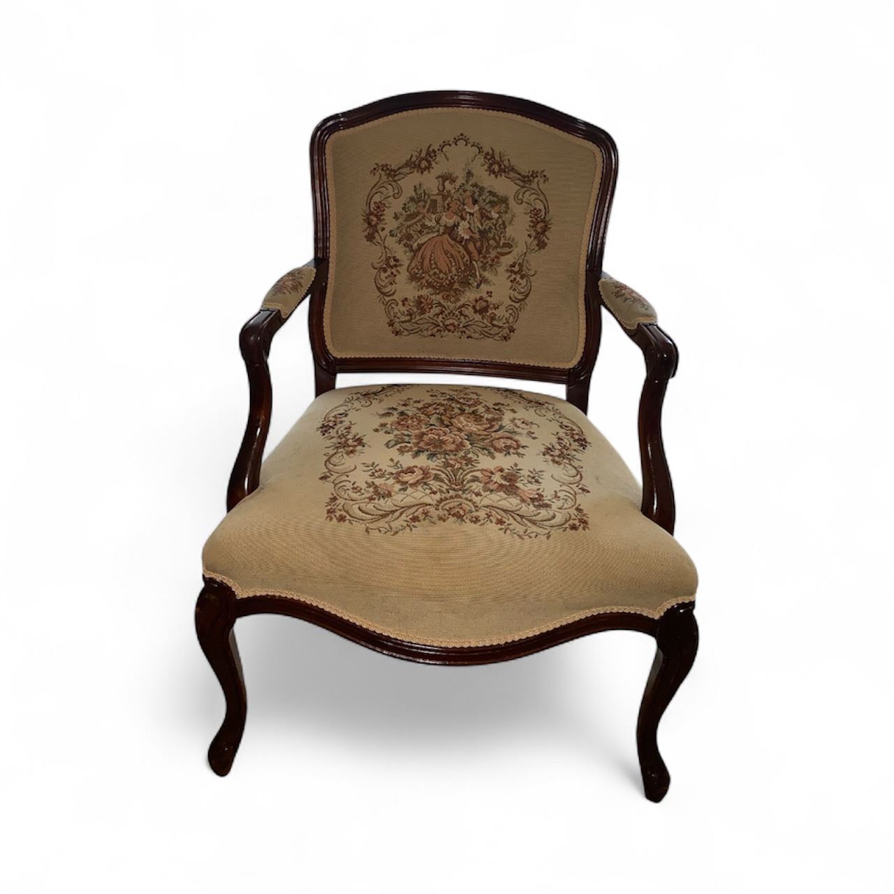 Vintage French Louis XV style arm chair with tapestry upholstery floral pattern