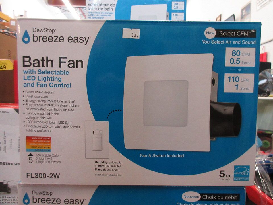 Model FL300-2W. Selectable LED lighting with switch. Humidity sensing fan control. Customer return.