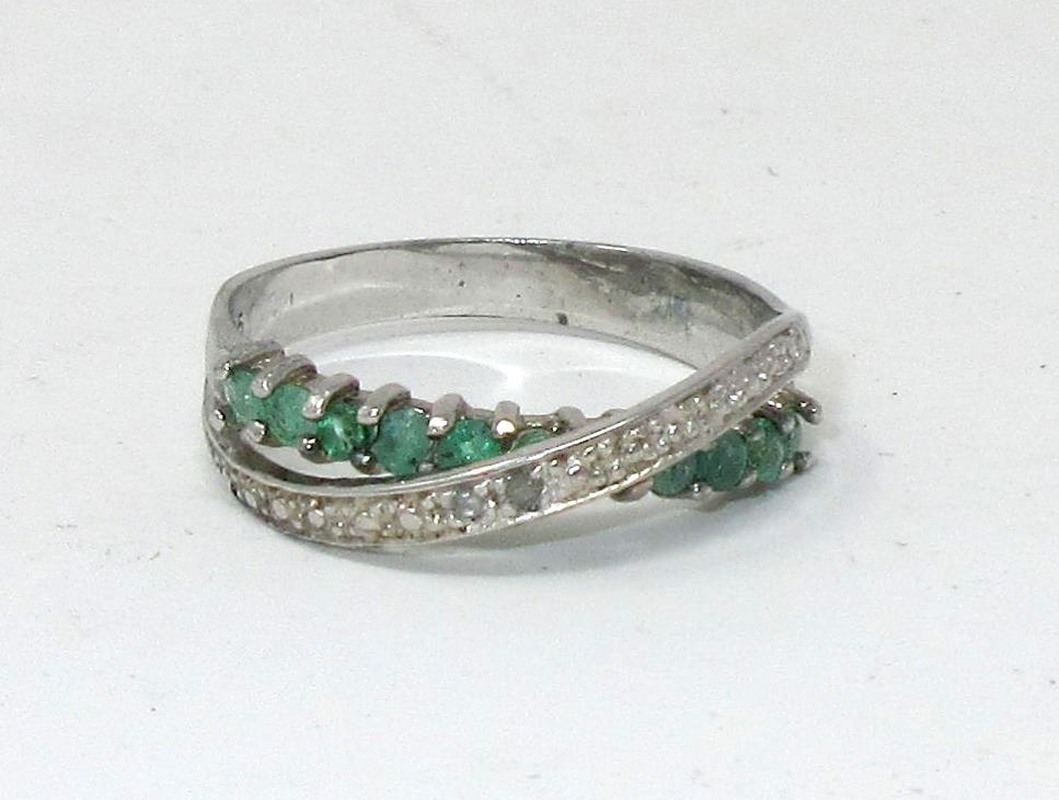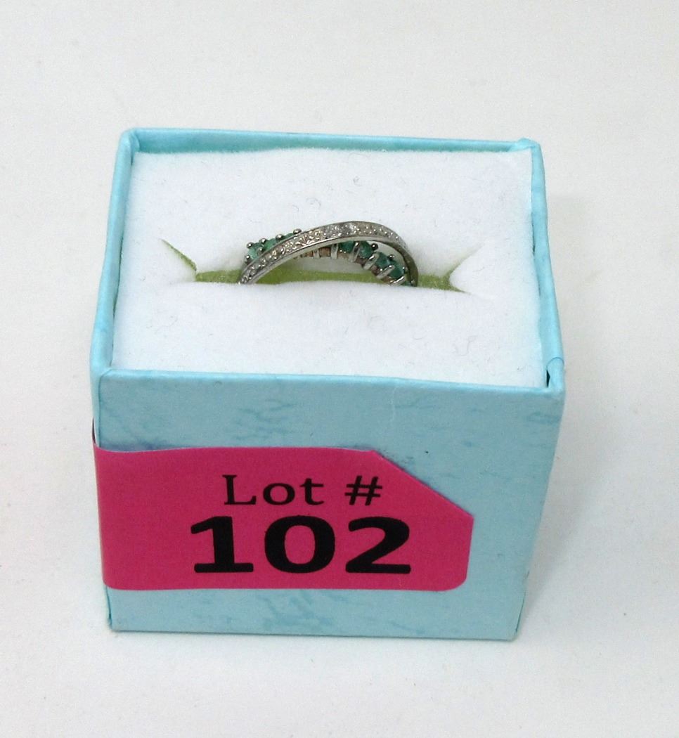 Sterling silver. Set with 11 round emeralds & 2 diamonds. Includes $450 certificate.