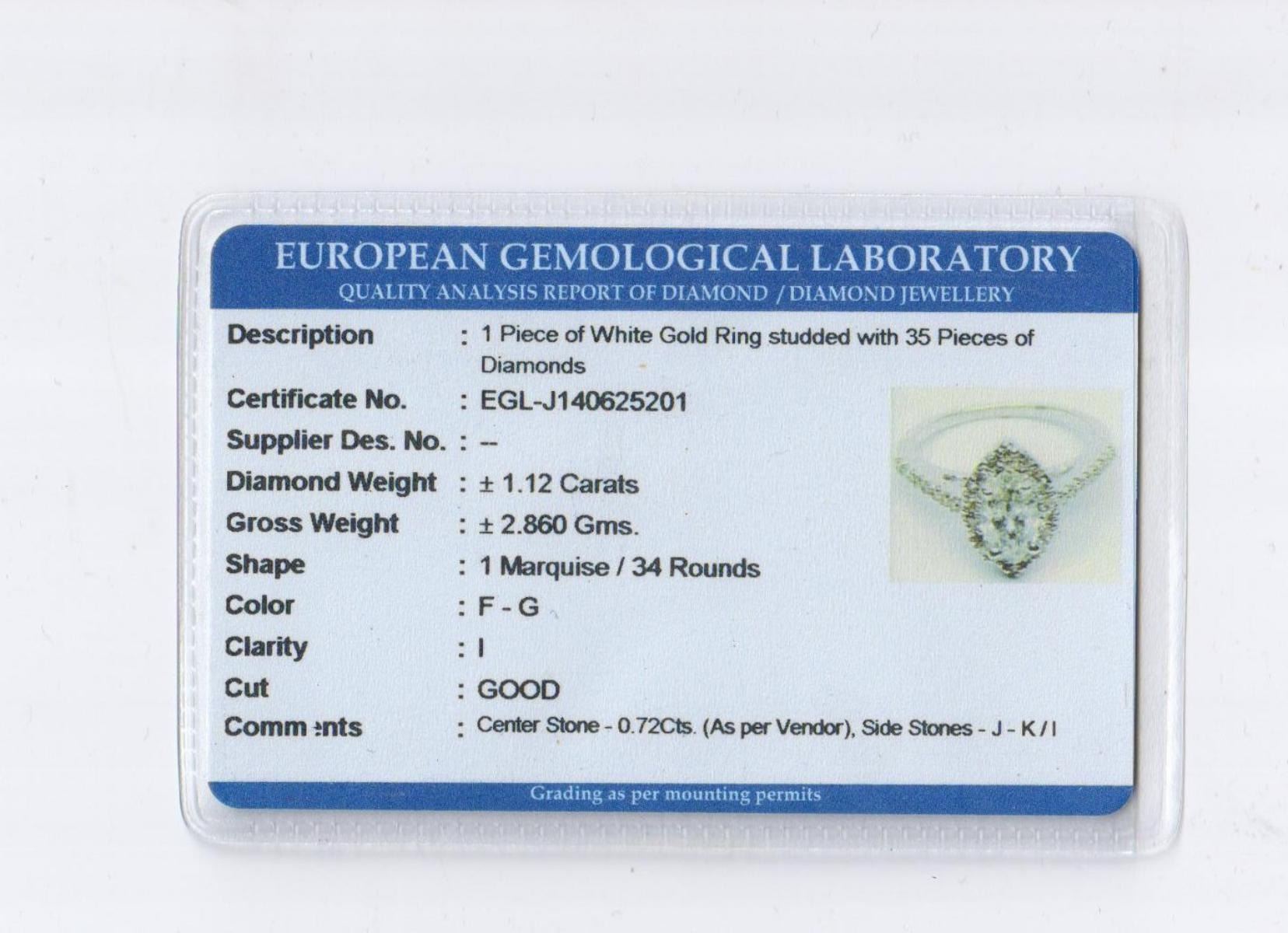 Diamond 1.12 carats Solid Gold Ring....14k solid white gold; Gross weight 2.860 grams...ring size 7.25; center stone 0.72 carats natural diamond completely free of treatment...I - F/G; Marquise cut;side stones 0.40 carats.... EGL certified