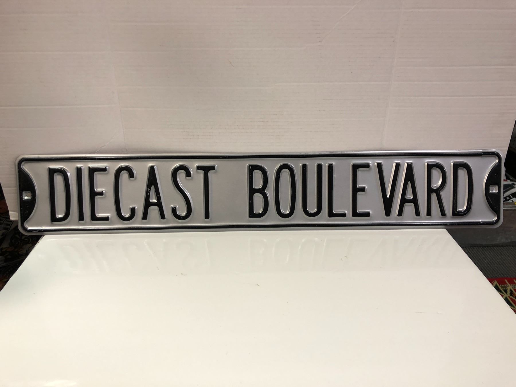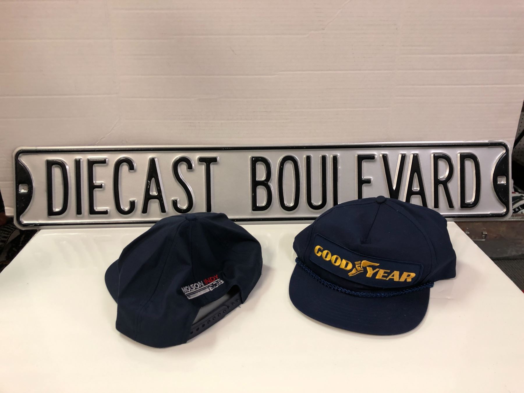 Diecast Boulevard Sign with Goodyear Molson Indy Baseball Hats (2) - sign is approx. 36in x 6in