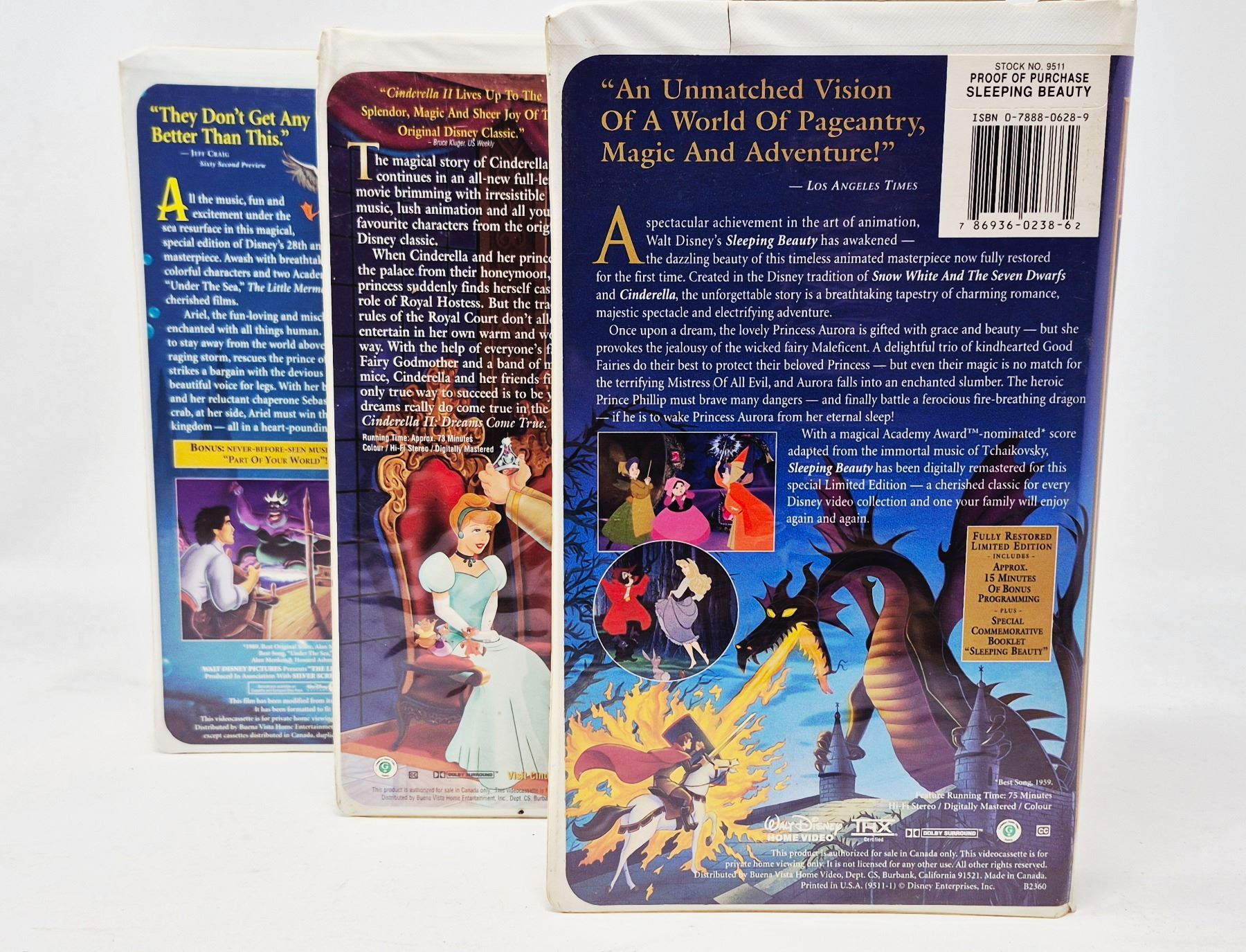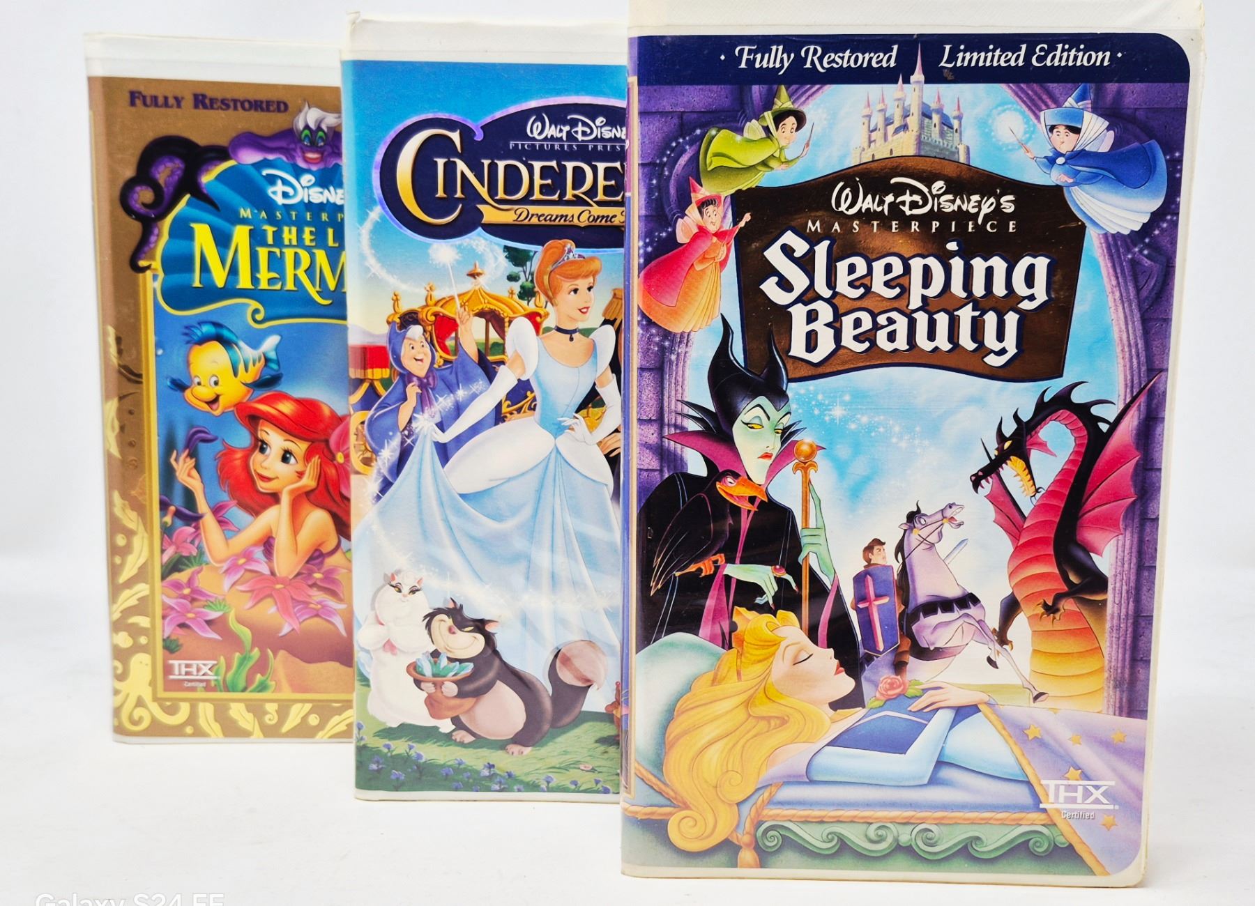 Classic princess tales fully restored on VHS: Sleeping Beauty, Cinderella, and The Little Mermaid. Magical clamshell editions for collectors.