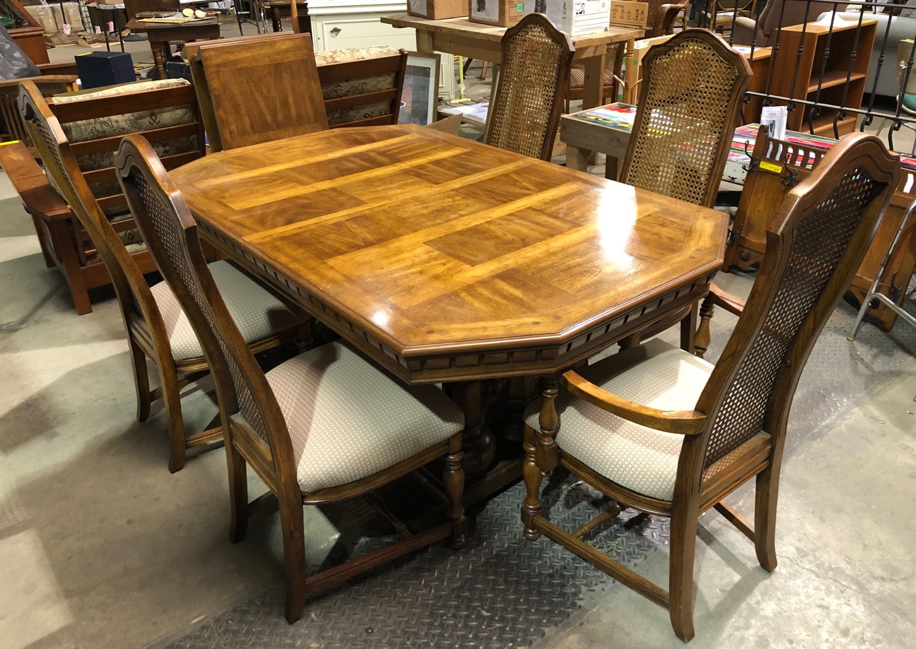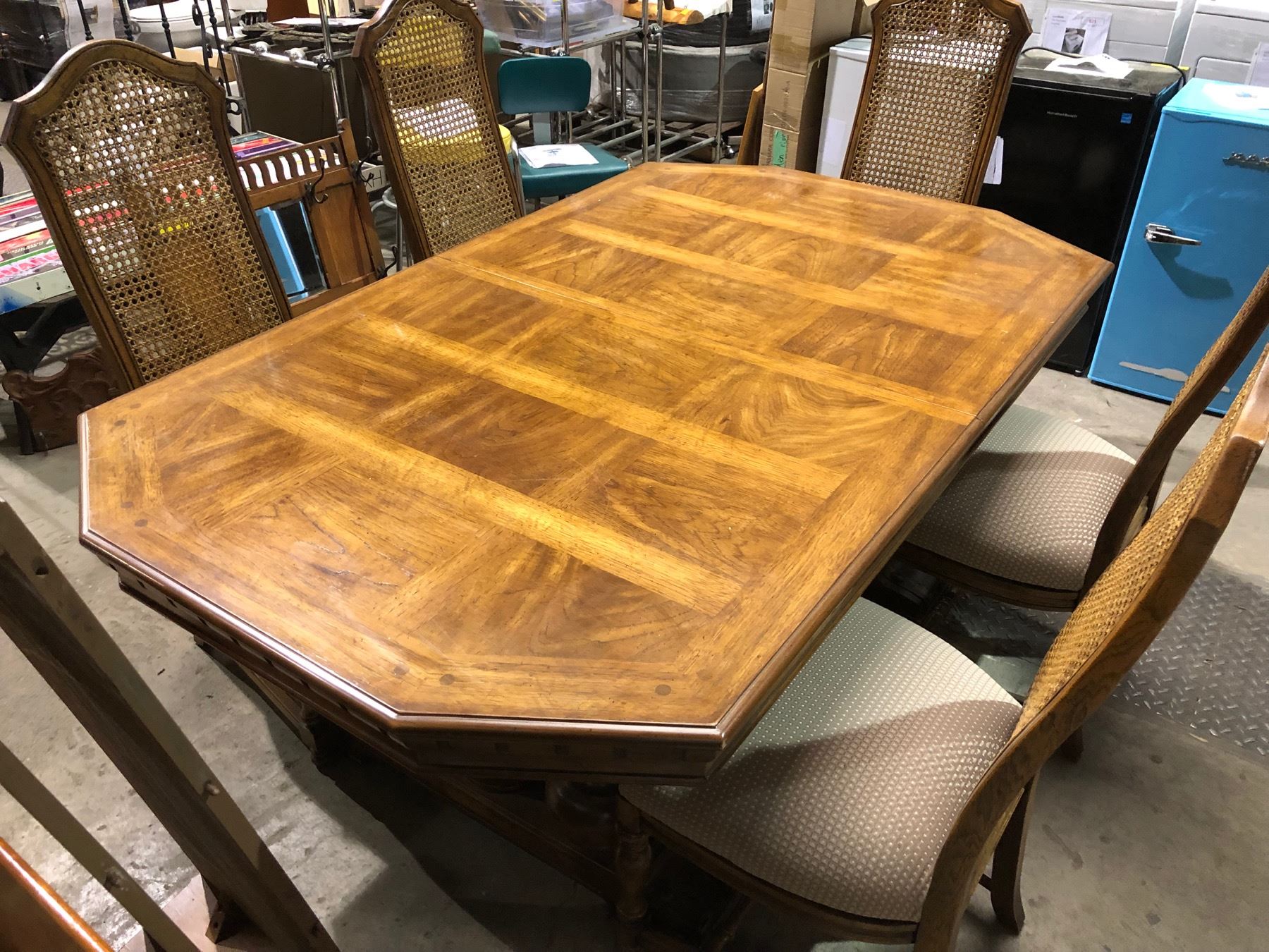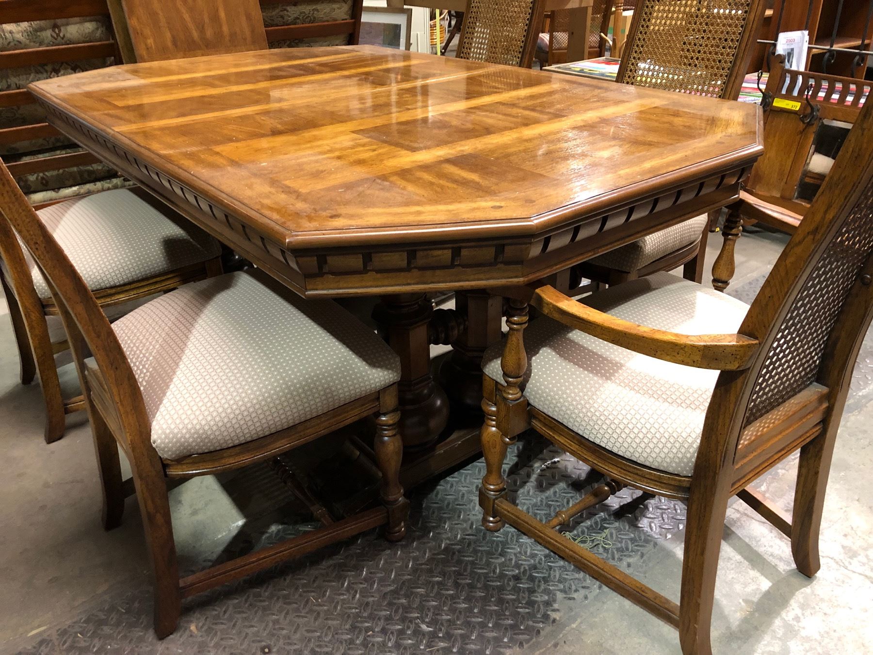 Double pedestal dining table w/ 5 chairs & 2 leaf extensions from the love showÊ