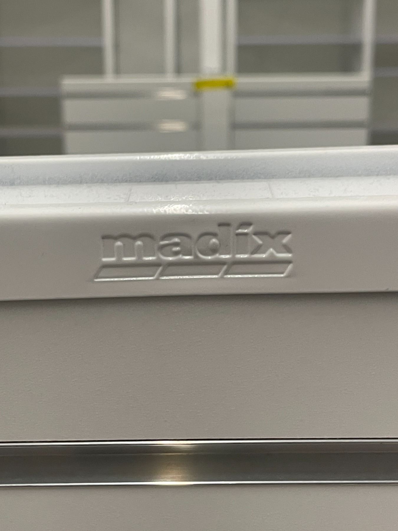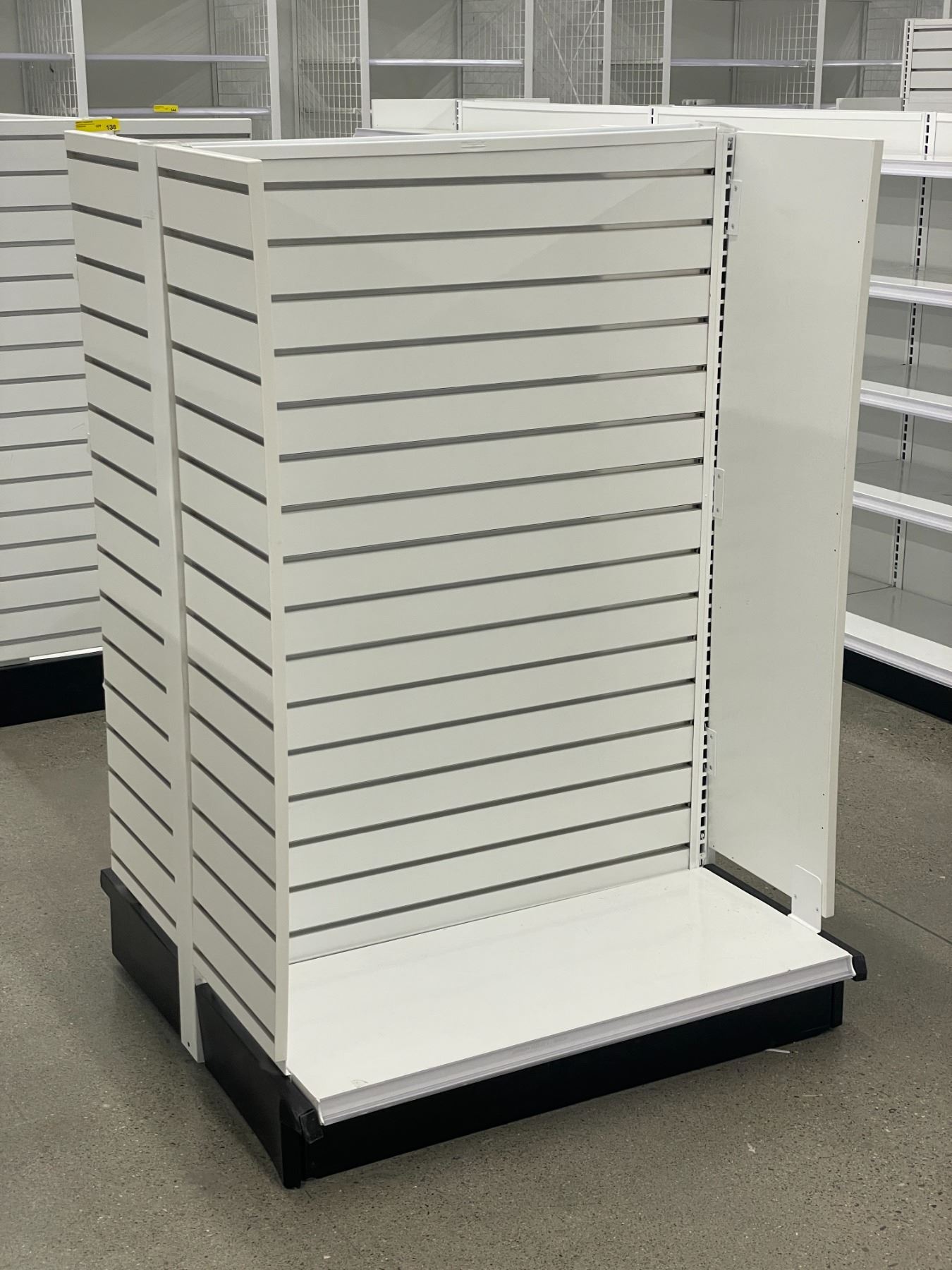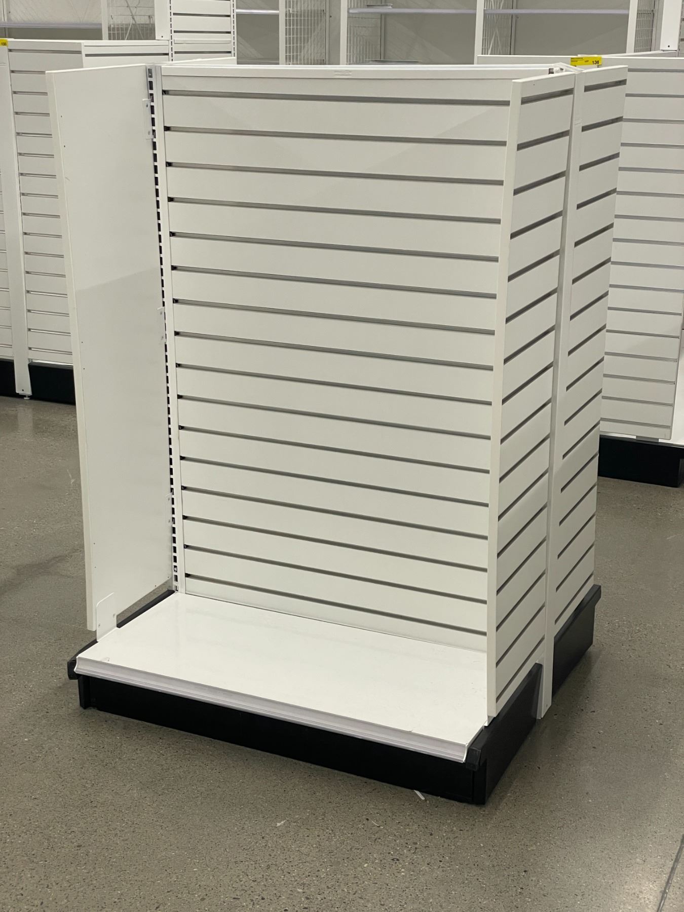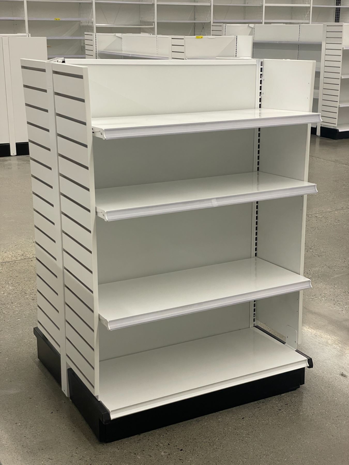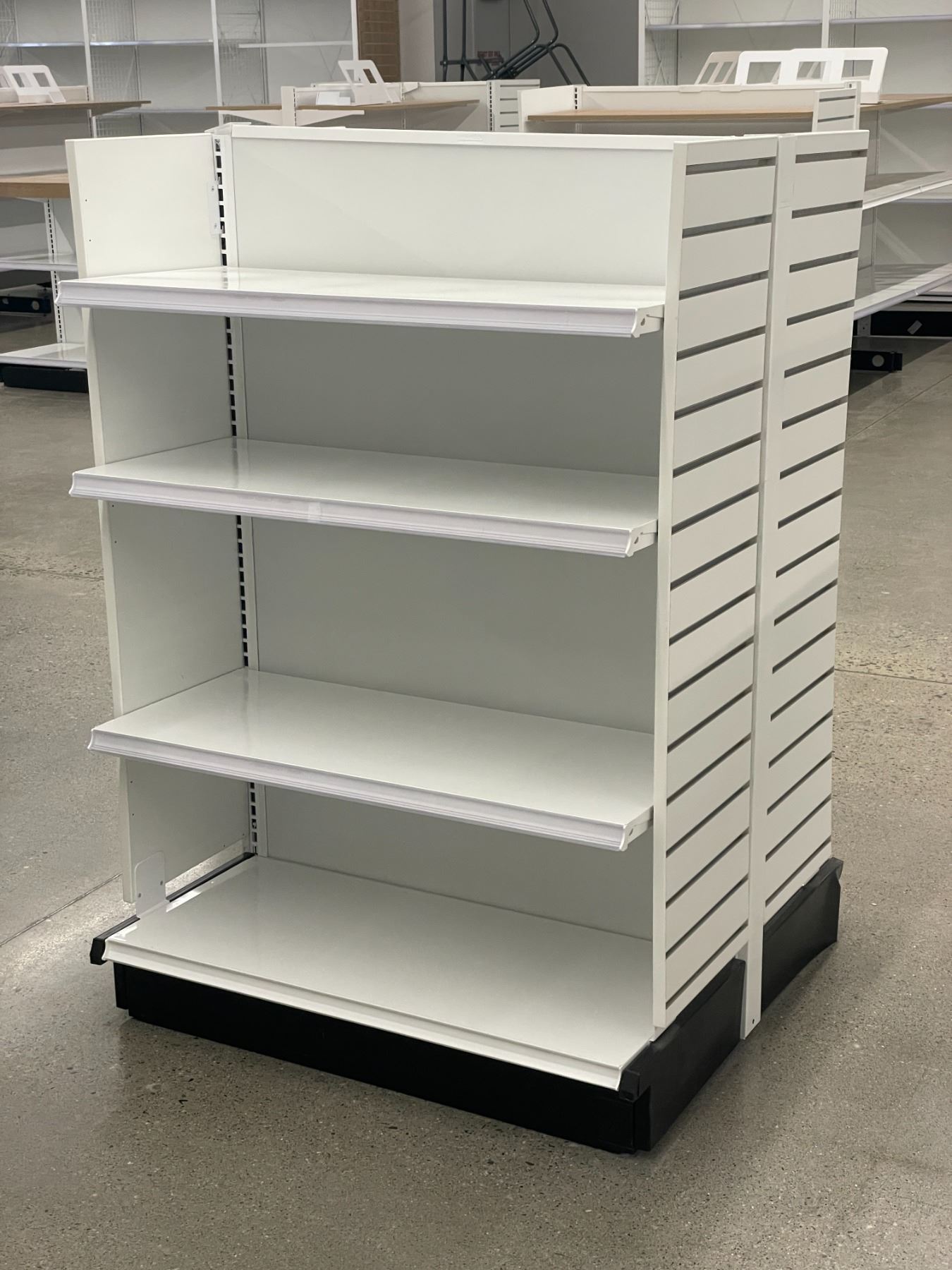 Double-sided retail shelving unit (approx. 34in W 59in H (69in w/sign holder) 38in D - excellent condition - Madix brand) BIDDERS ARE RESPONSIBLE FOR ALL COSTS ASSOCIATED WITH PICKUP OF THEIR LOTS INCLUDING BUT NOT LIMITED TO RENTAL OF EQUIPMENT, FORKLIFTS, LABOUR, TRUCKING, TOOLS ETC.