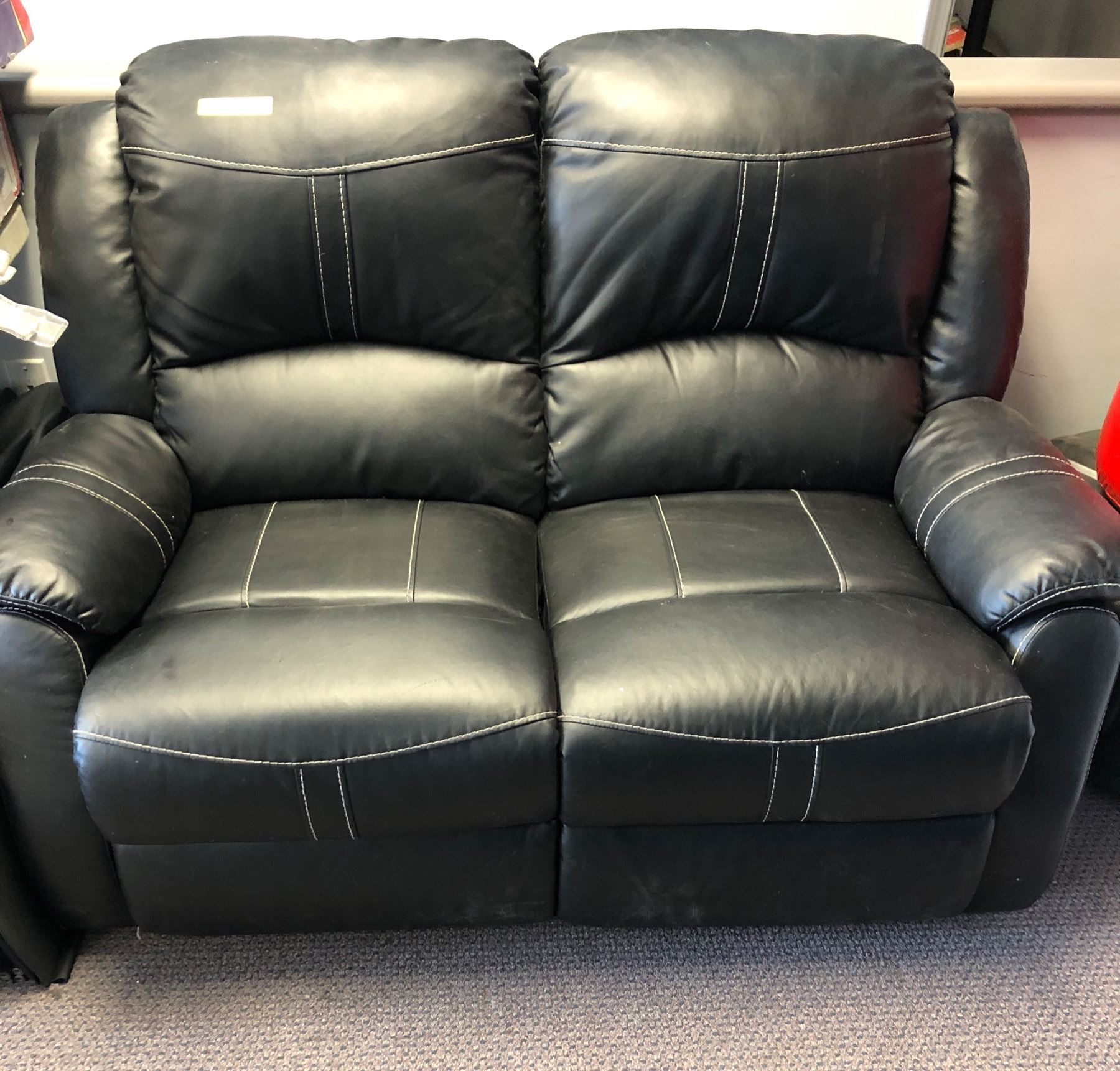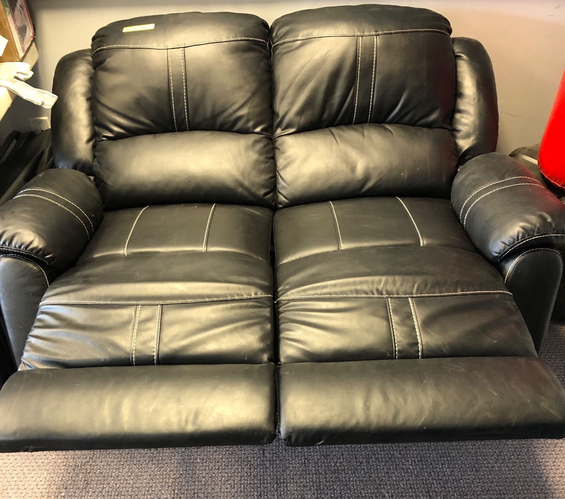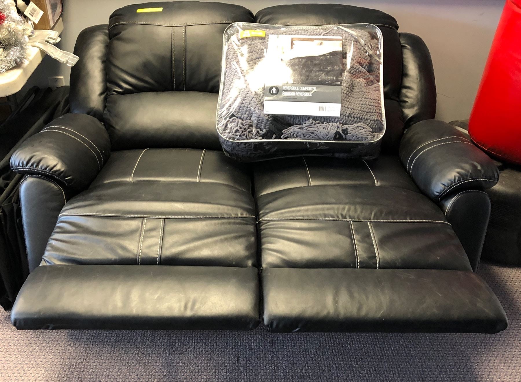Dual reclining black leather loveseat sofa w/ reversible comforter - approx. 5ft wide x 3ft depth x 41in height unreclined position