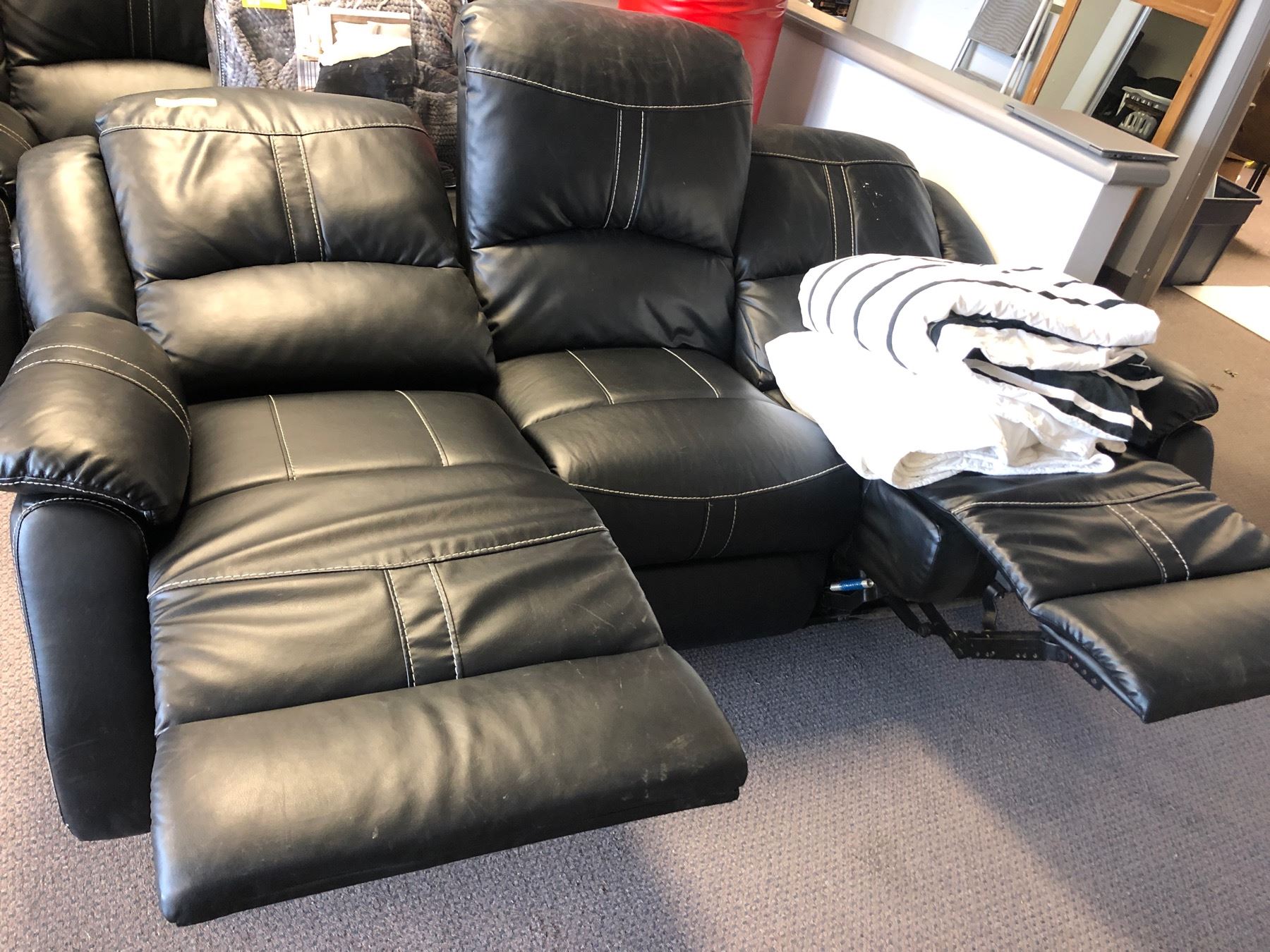 Dual reclining black leather sofa w/ throw blankets - approx. 81in wide x 3ft depth x 41in height unreclined position dimensions