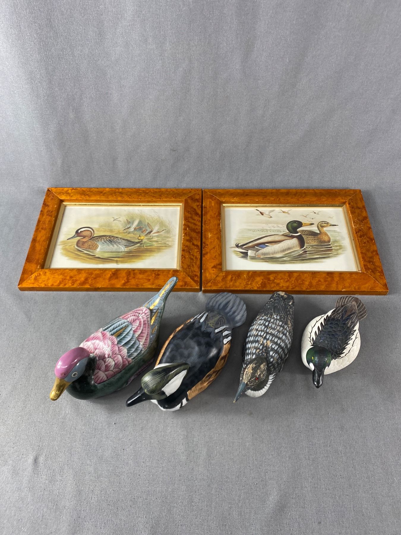 Duck Décor Lot - 2 Framed Vintage Duck Prints (13" x 10", 2 WoodCarved Ducks, Ceramic Duck & HandCrafted Golden Eye