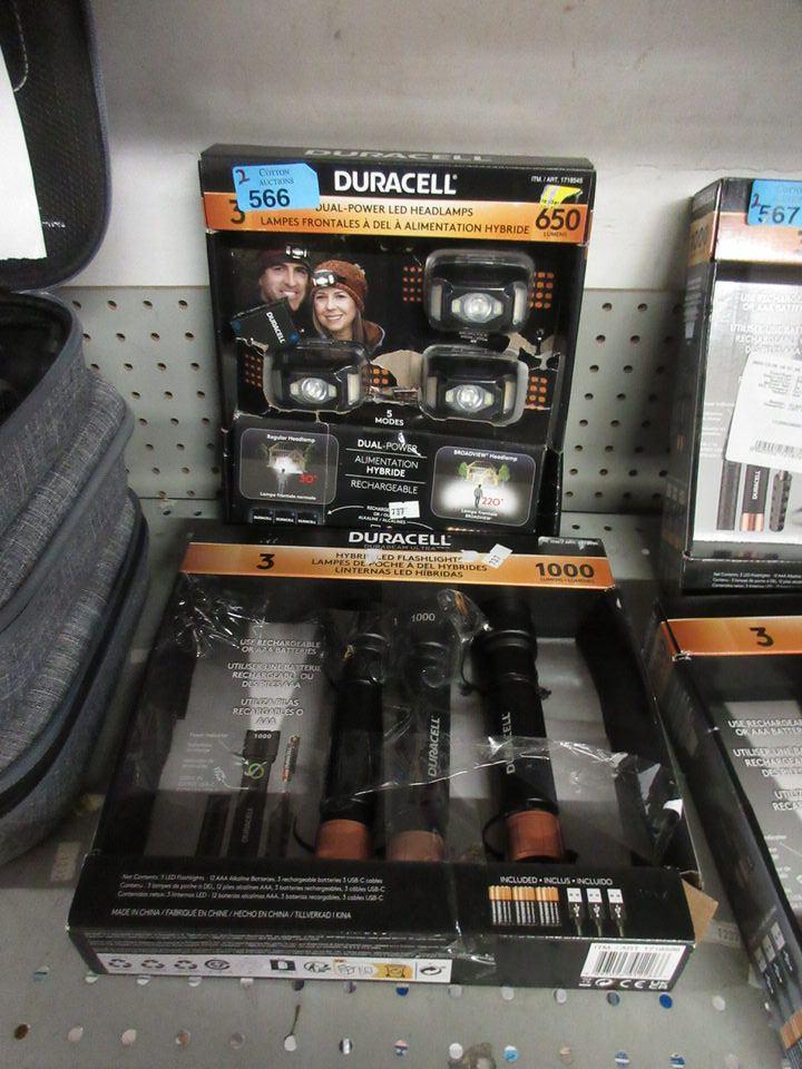 Set of 3 Duracell headlamps & set of 3 flashlights. Customer returns.