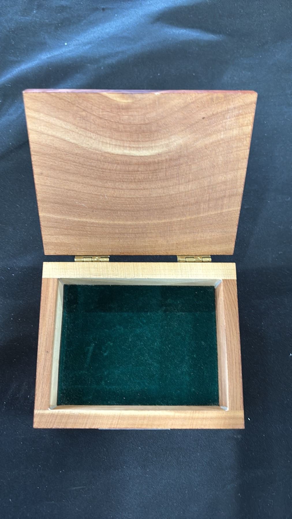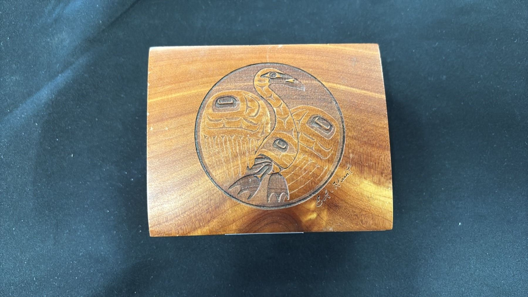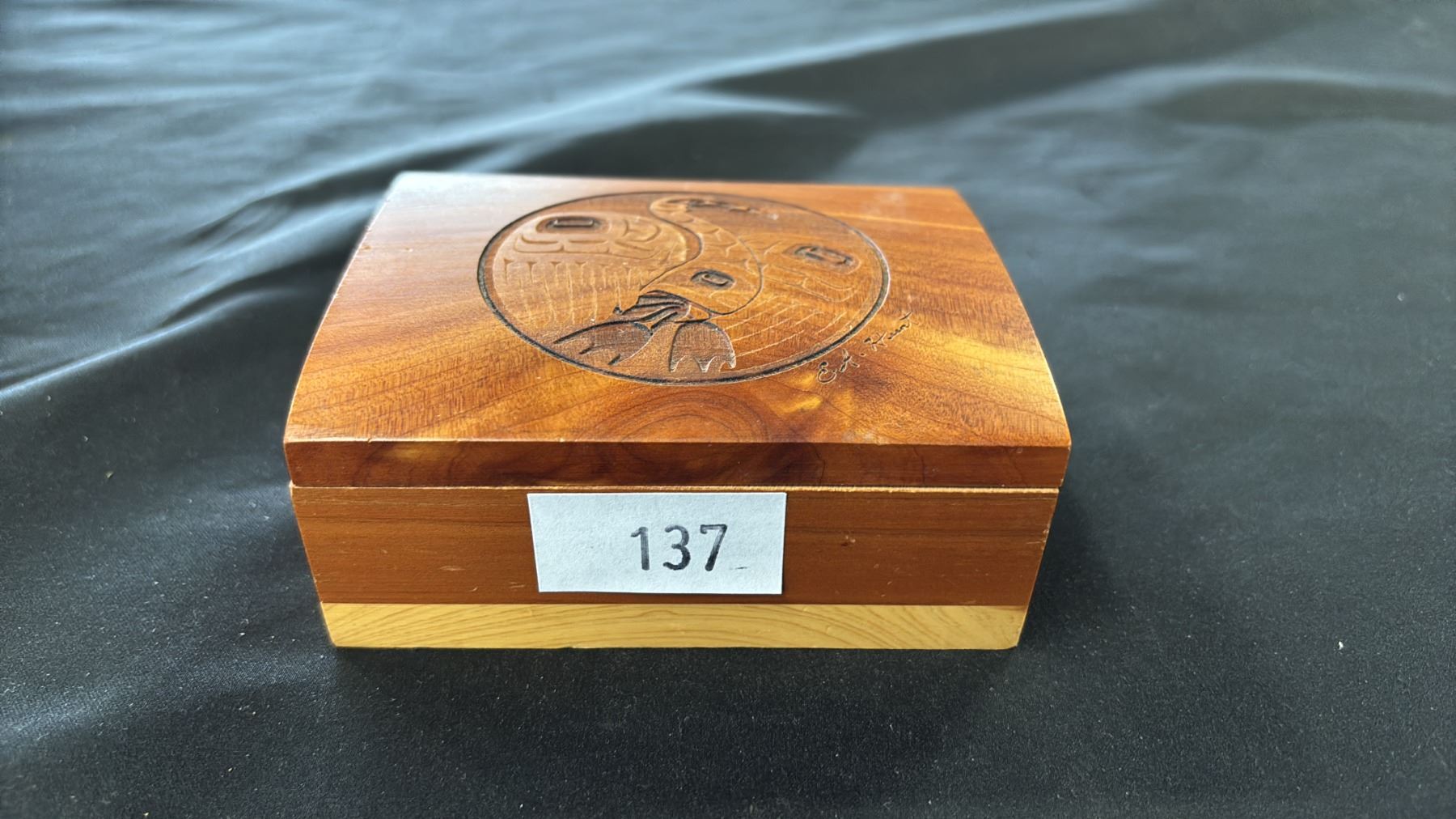 E.A HUNT CARVED CEDAR BOX - 4 1/4"W X 3 1/2"D X 1 3/4"H