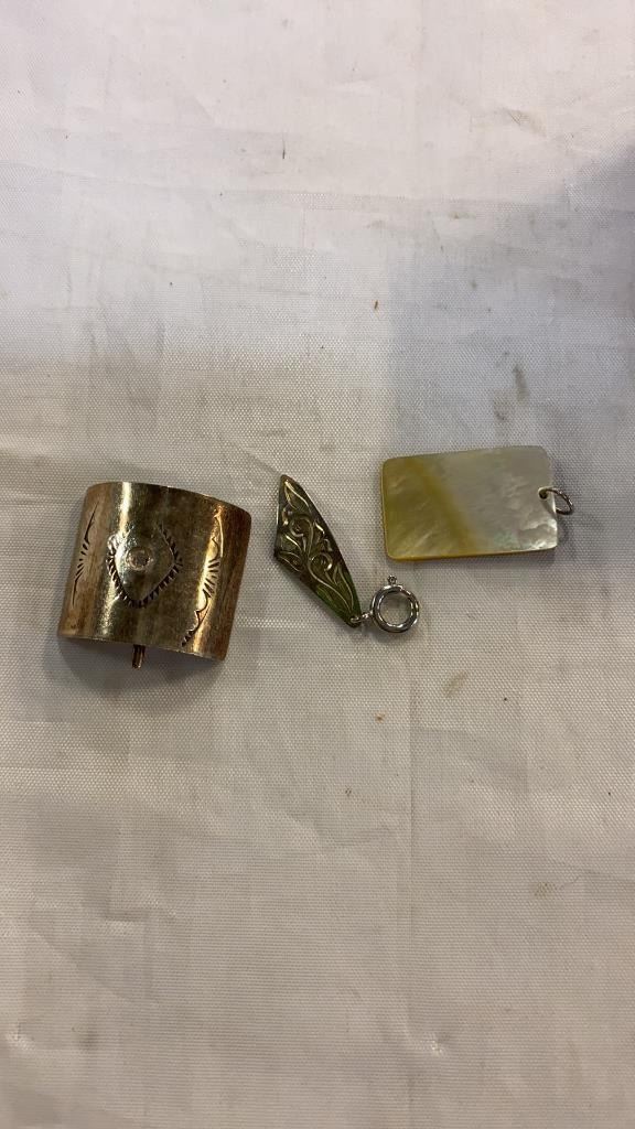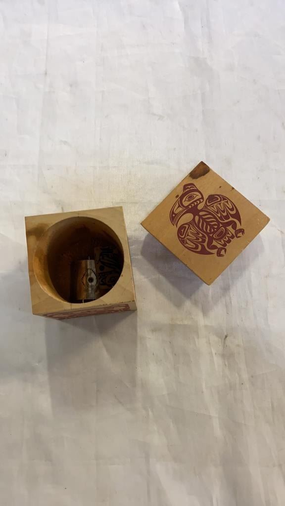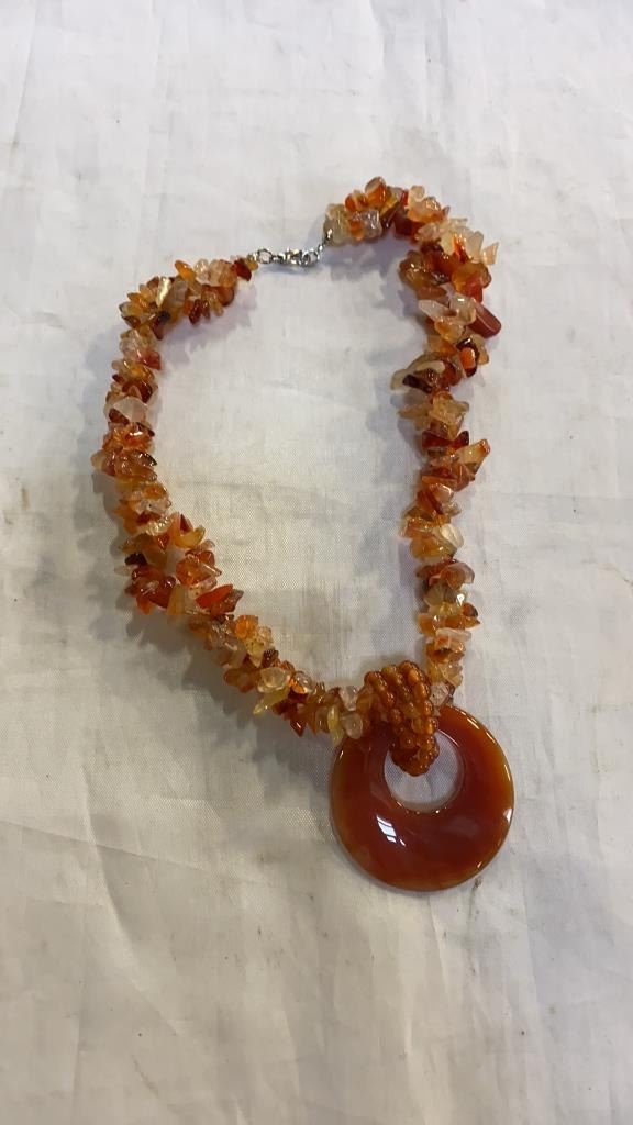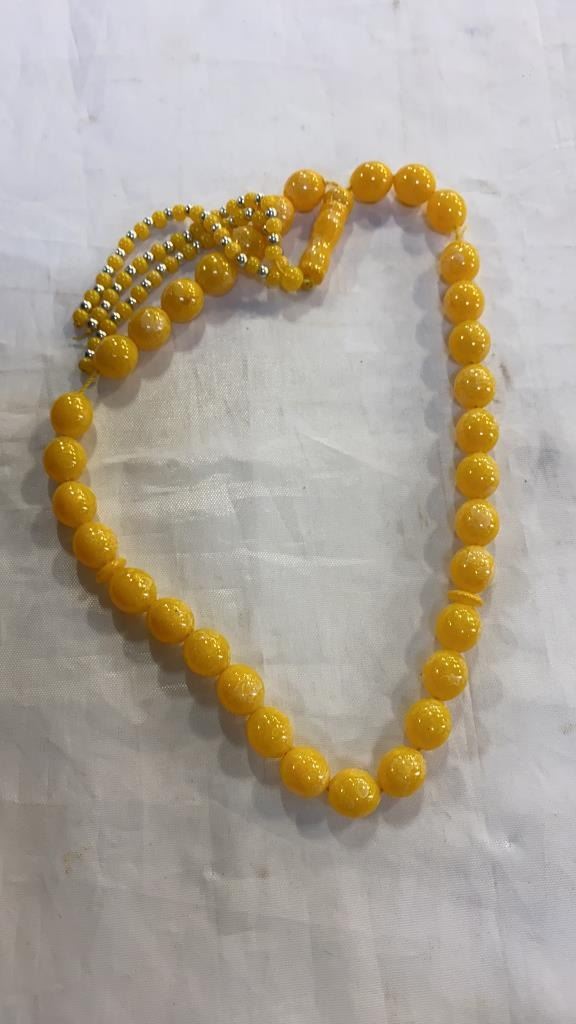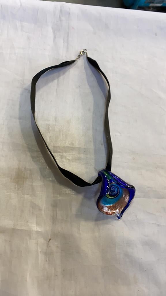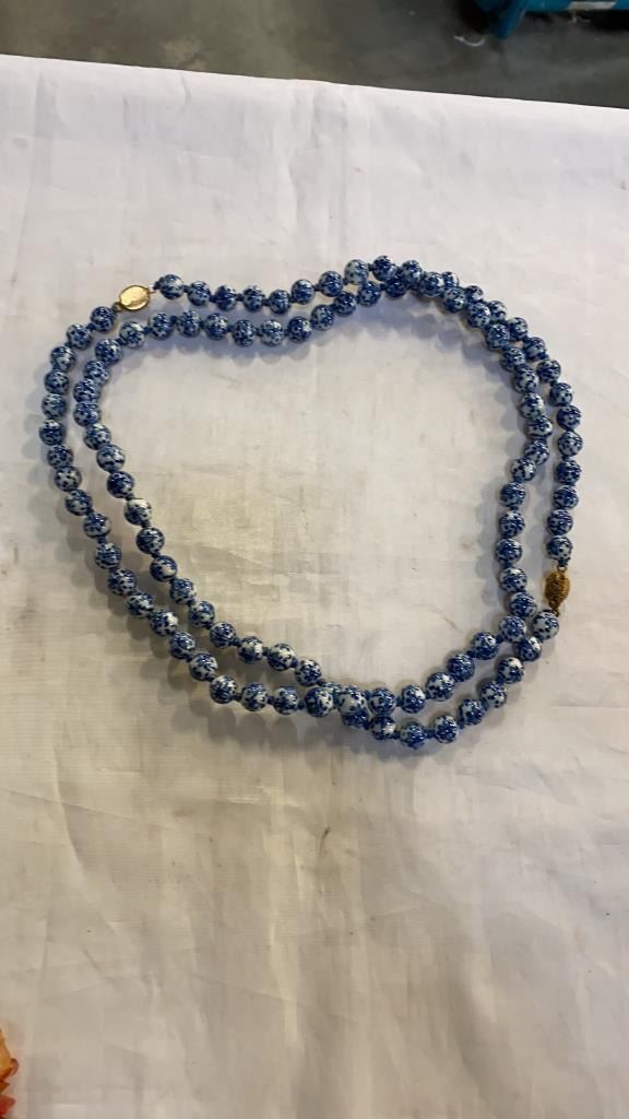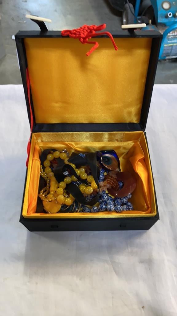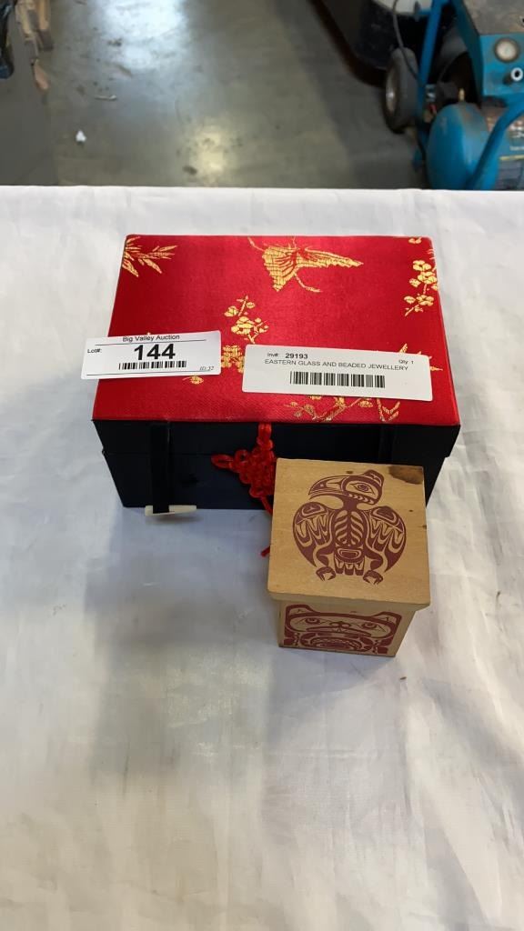 EASTERN GLASS AND BEADED JEWELLERY AND NATIVE BOX W/ CONTENTS