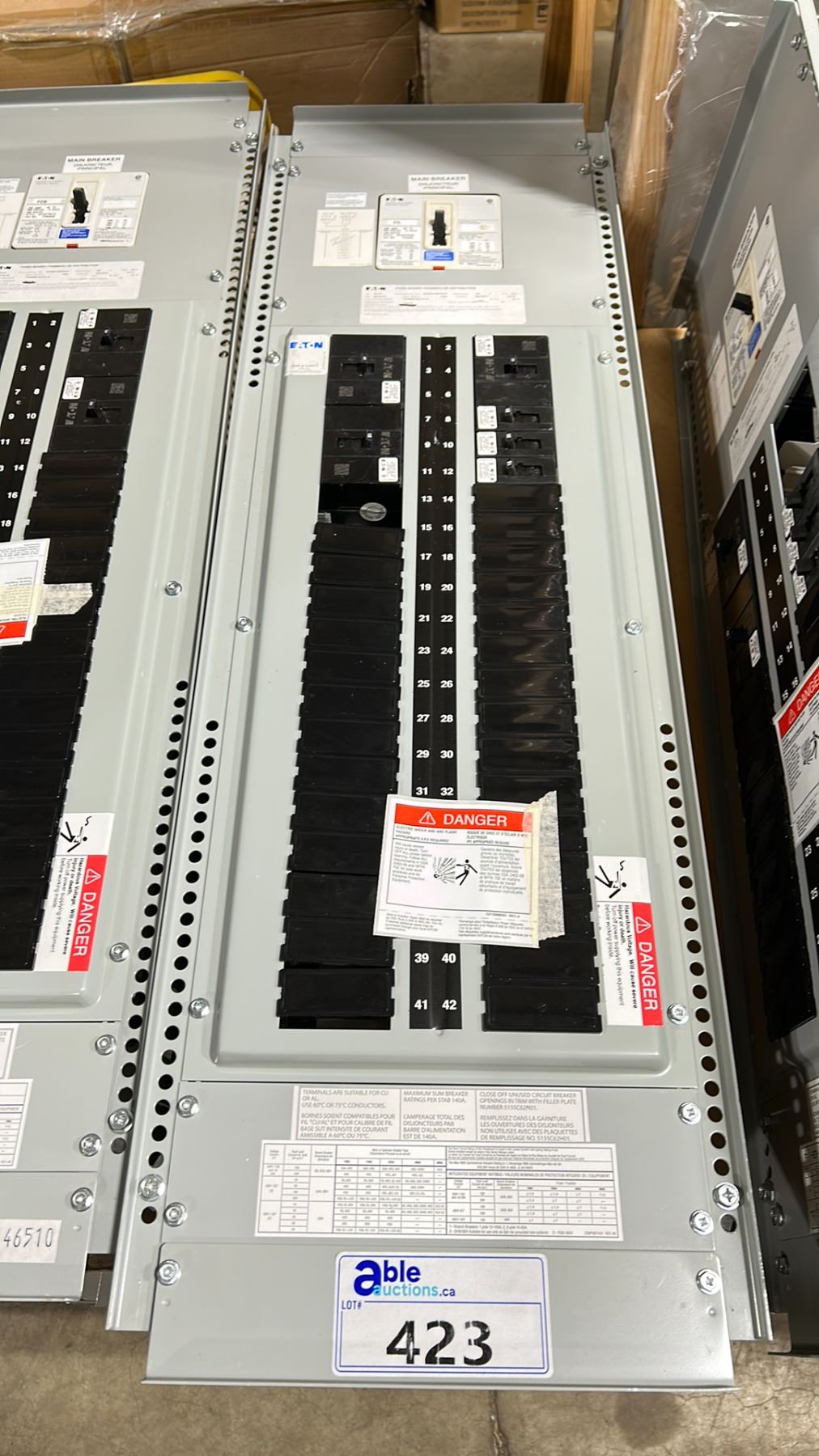 EATON POW-R-LINE COMMERCIAL 42 BREAKER POWER DISTRIBUTION BOX WITH ASSORTED BREAKERS & MAIN SHUT-OFF