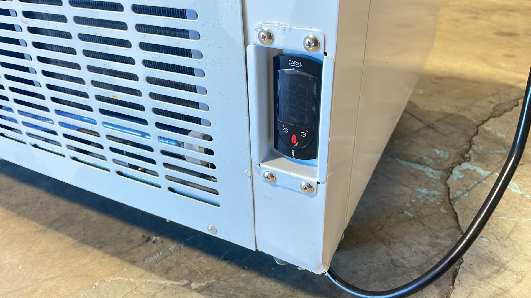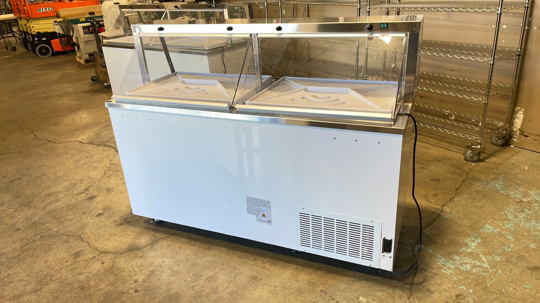 EFI FICDC-68 2 STATION SLANT TOP COMMERCIAL ILLUMINATED ELECTRIC MOBILE ICE CREAM DISPLAY CABINET 2X WHITE COVER TRAYS, ASSORTED WHITE PLASTIC ICE CREAM BUCKET INSERTS, & 2 METAL RACKS