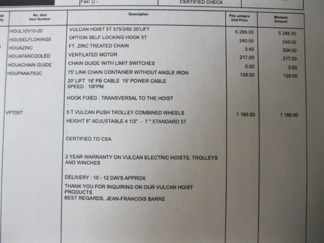 ELECTRIC 5 TON VULCAN OVERHEAD CHAIN HOIST WITH MOVING TRACK ROLLER, REPLACEMENT WITH TAX OVER $7000