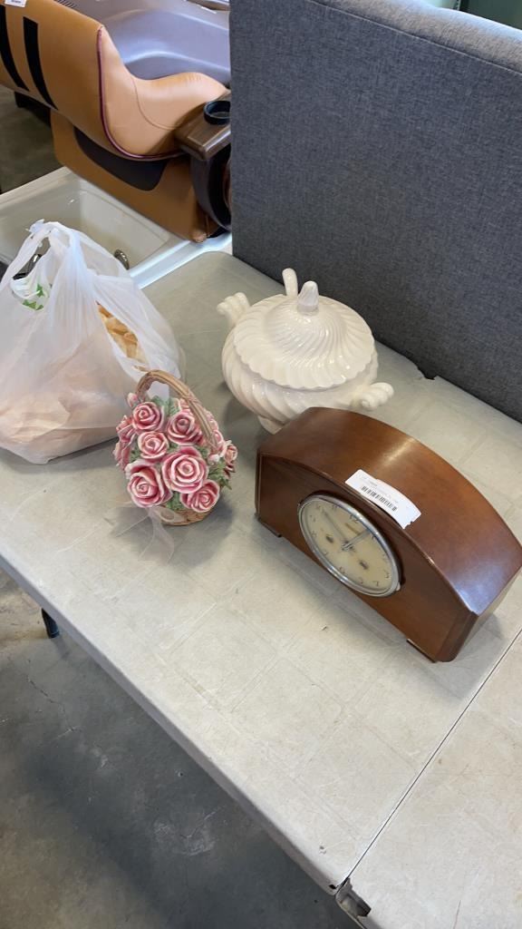 ELECTRIC SOUP TUREEN, OIL LAMP, MUSICAL FLOWER BOUQUET AND MANTLE CLOCK