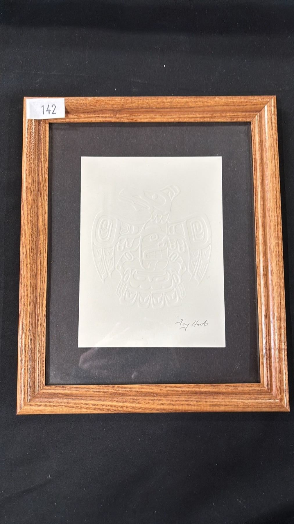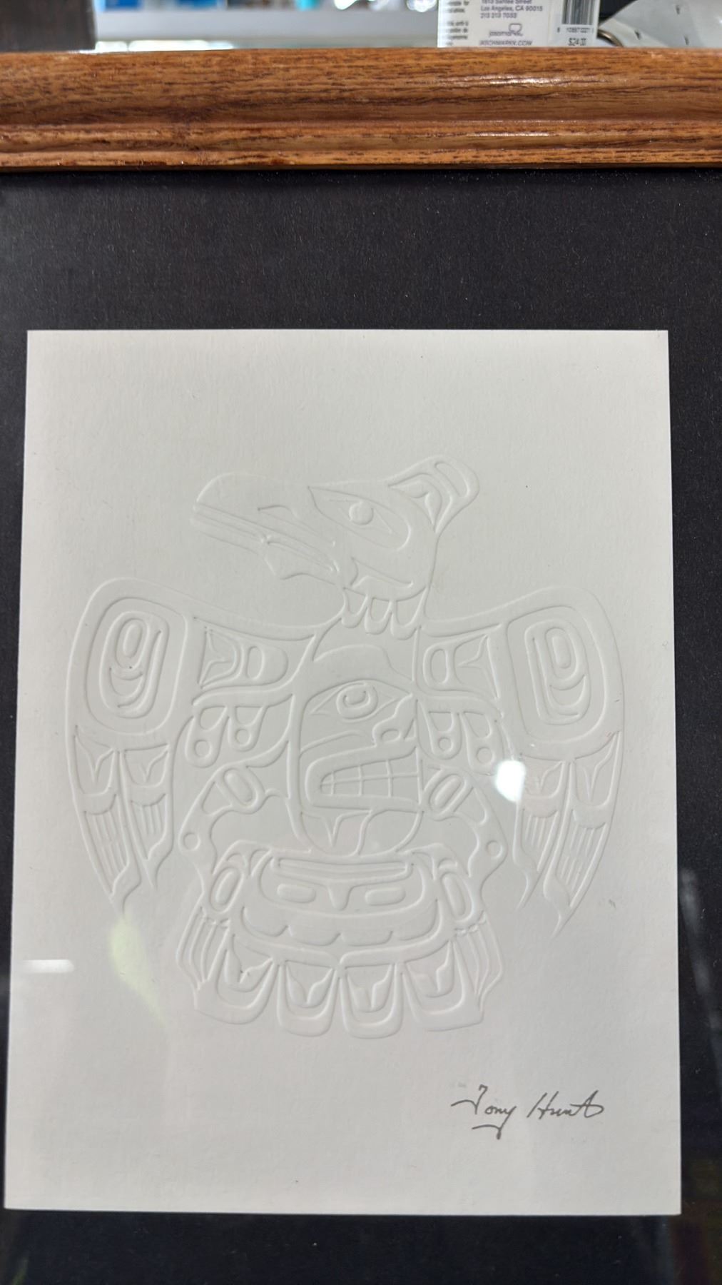 EMBOSSED FRAMED NATIVE ARTWORK SIGNED BY TONY HUNT - 9 1/2 W X 11 1/2 H