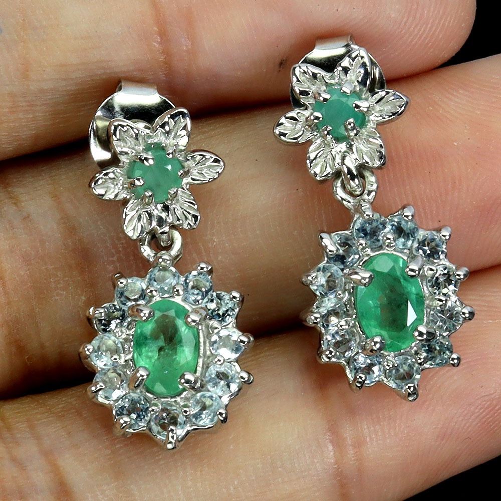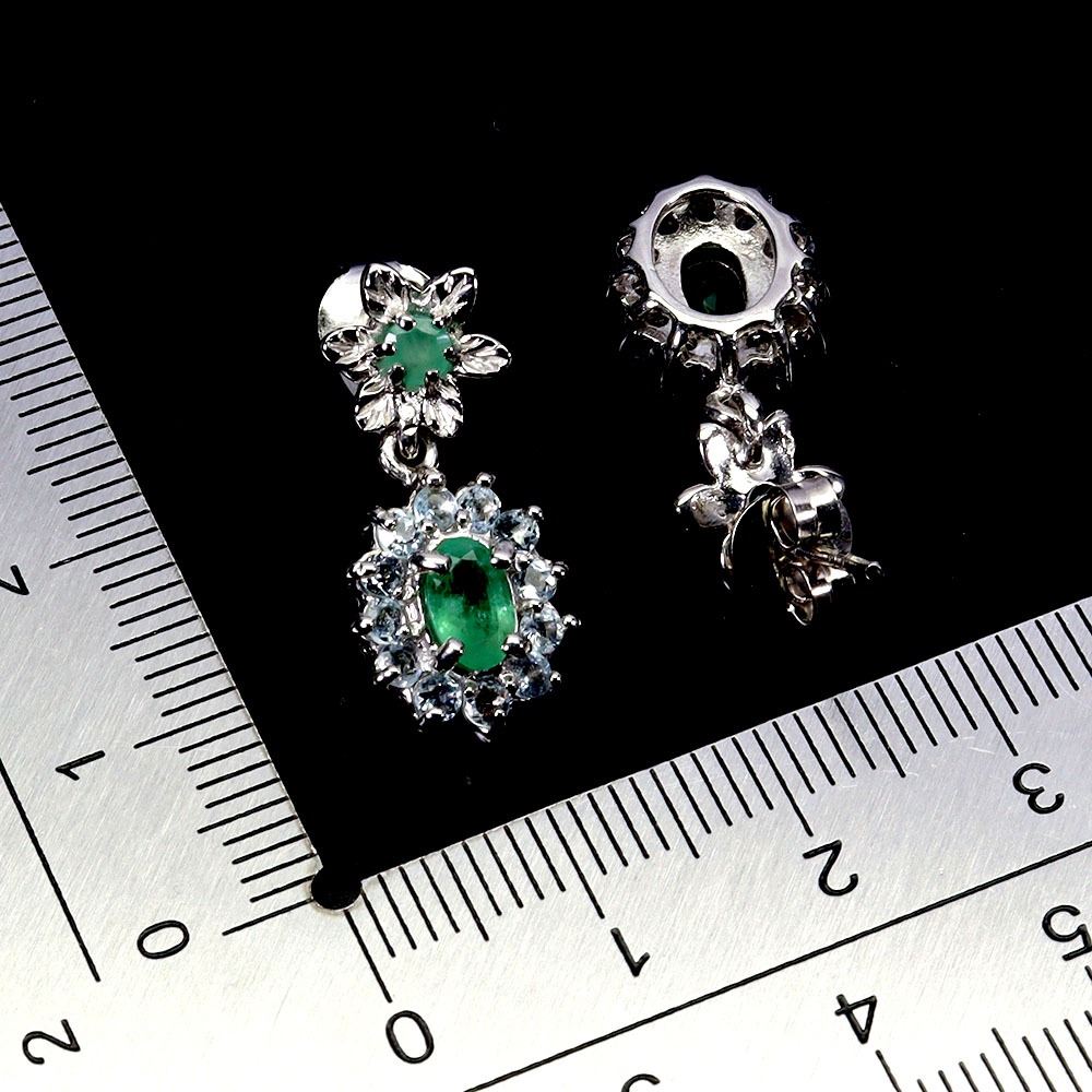 EMERALD AND AQUAMARINE EARRINGS IN 14K WHITE PLATED GOLD OVER 925 STERLING SILVER - APPRAISED REPLACEMENT VALUE