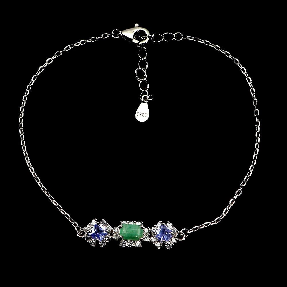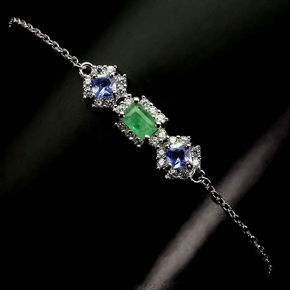 EMERALD AND TANZANITE BRACELET IN 14K WHITE PLATED GOLD OVER 925 STERLING SILVER - 8 INCHES LONG - APPRAISED REPLACEMENT VALUE