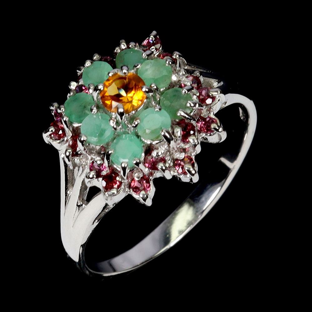 EMERALD, CITRINE AND RHODOLITE GARNET RING IN 14K WHITE PLATED GOLD OVER 925 STERLING SILVER - SIZE