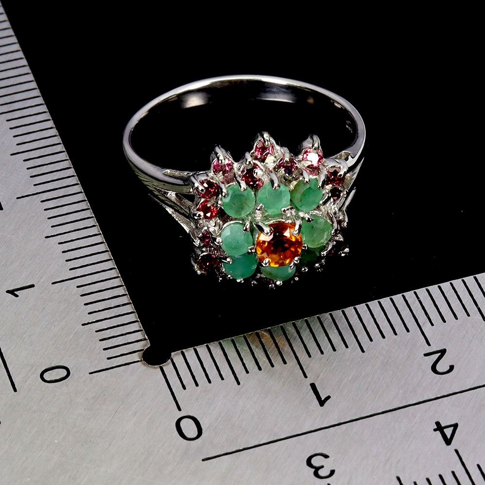 EMERALD, CITRINE AND RHODOLITE GARNET RING IN 14K WHITE PLATED GOLD OVER 925 STERLING SILVER - SIZE 8 - APPRAISED REPLACEMENT VALUE