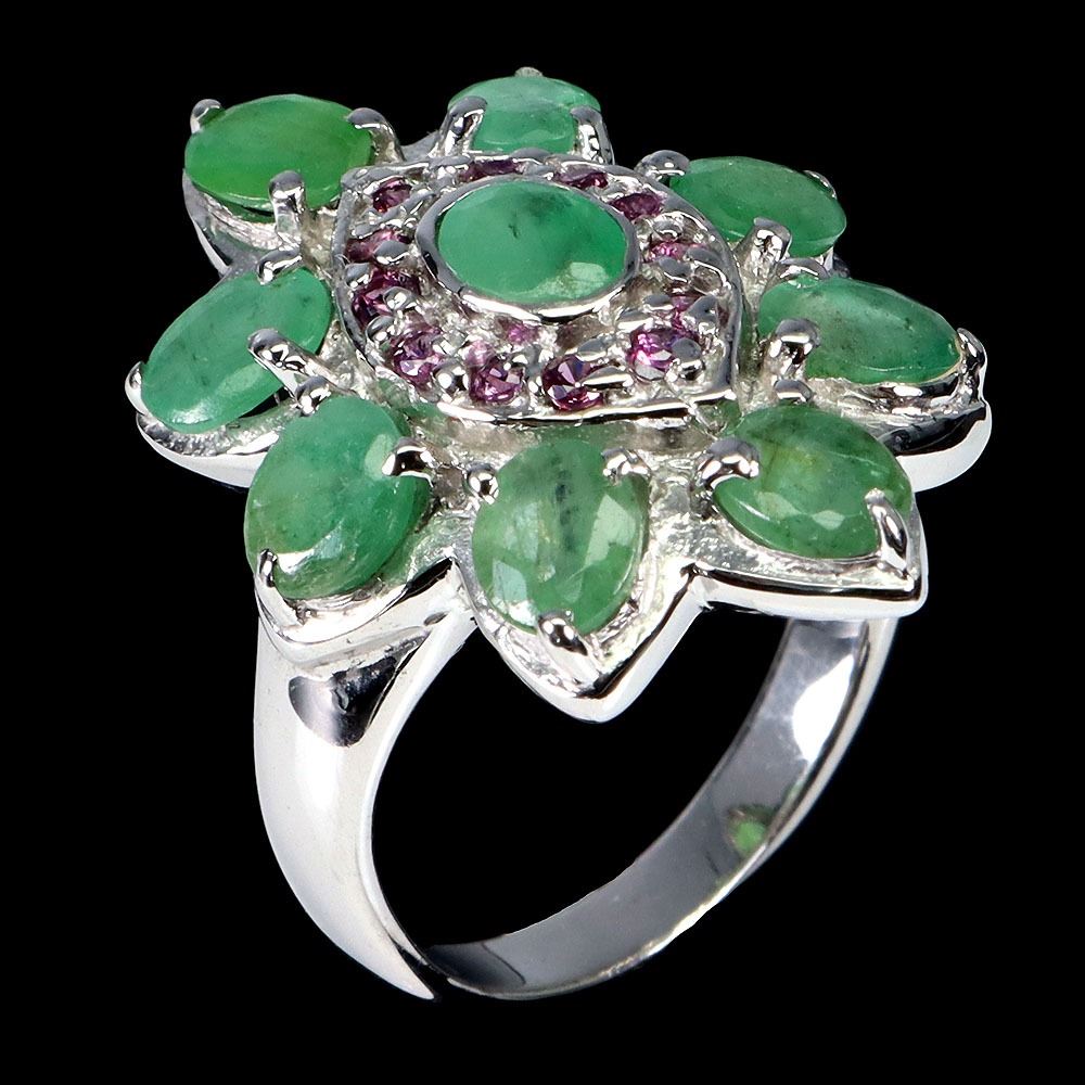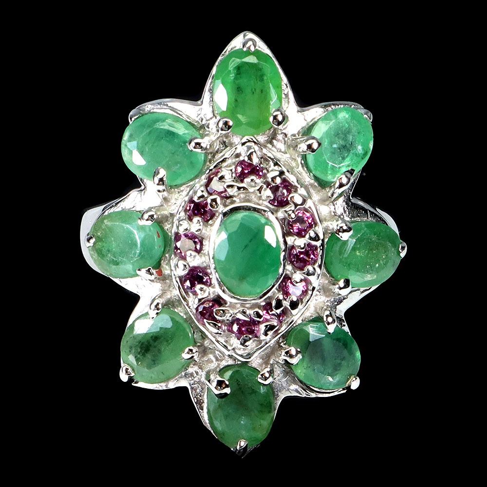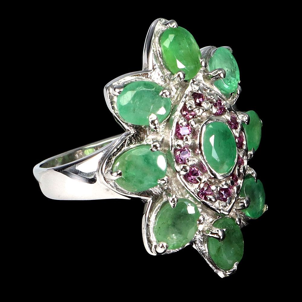 EMERALD, RHODOLITE GARNET RING in 14K White Gold plated 925 Sterling Silver – Size 7 – Appraised Replacement Value CAD 1,360
