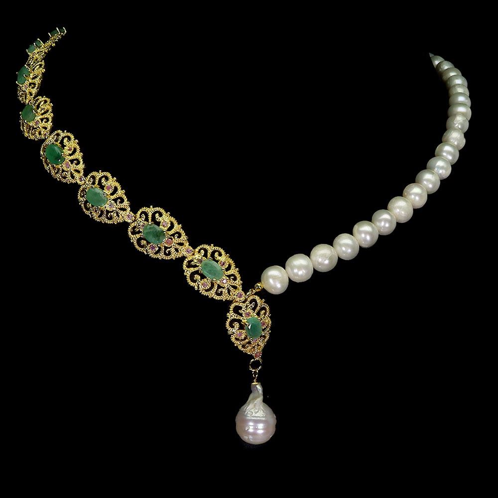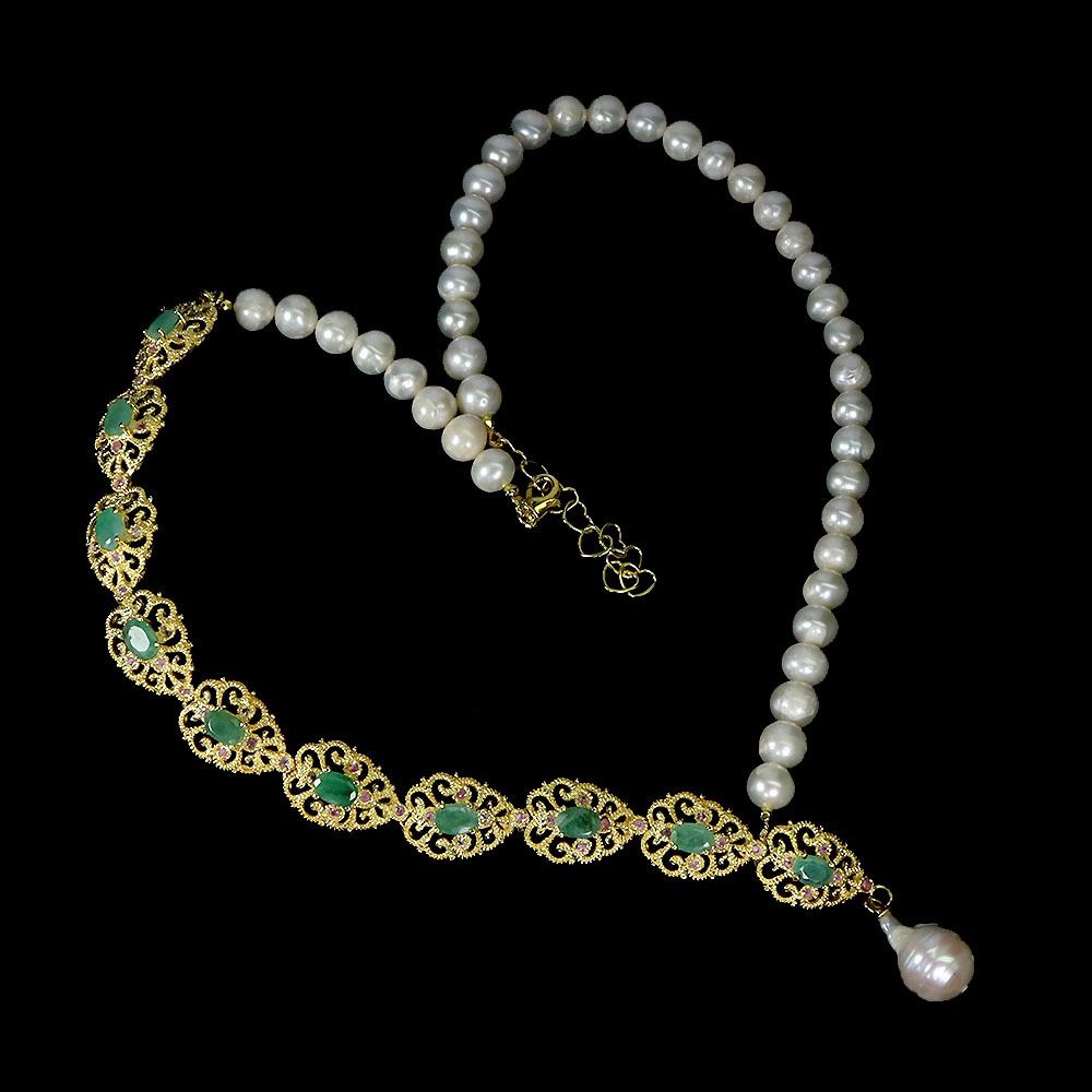 EMERALD, RUBY and PEARL NECKLACE in 14K Yellow Gold plated 925 Sterling Silver – 19 Inches long - Appraised Replacement Value CAD 9,800