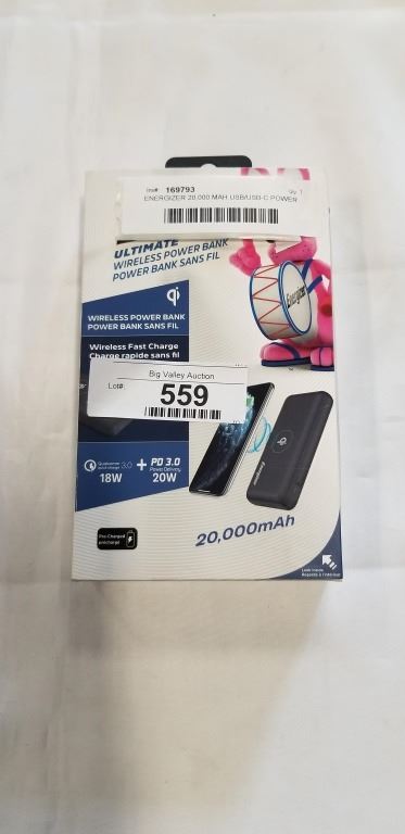 ENERGIZER 20,000 MAH USB/USB-C POWER BANK W/ WIRELESS QI CHARGER - RETAIL $89