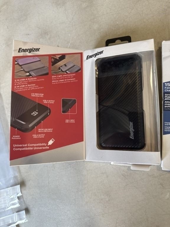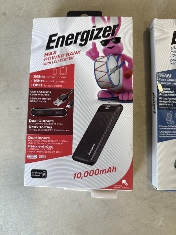 ENERGIZER MAX POWER BANK WITH LCD SCREEN AND DUAL OUTPUTS, AND ENERGIZER ULTIMATE MAGNETIC WIRELESS FAST CHARGE FOLDING CHARGER STAND
