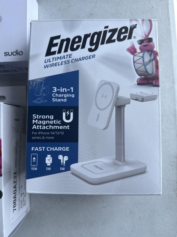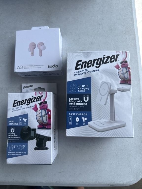 ENERGIZER ULTIMATE FAST CHARGE WIRELESS 3 IN 1 CHARGING STAND, ENERGIZER ULTIMATE WIRELESS CAR CHARGER, AND SUDIO A2 BLUETOOTH WIRELESS EARBUDS