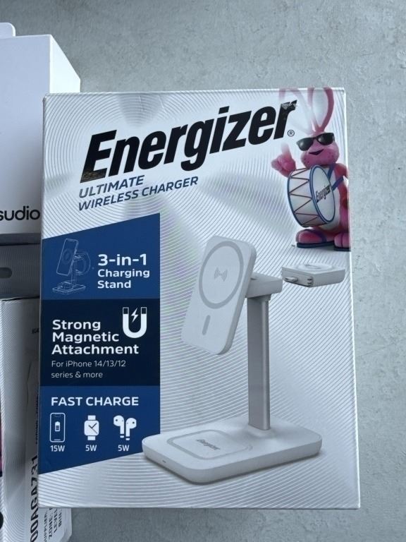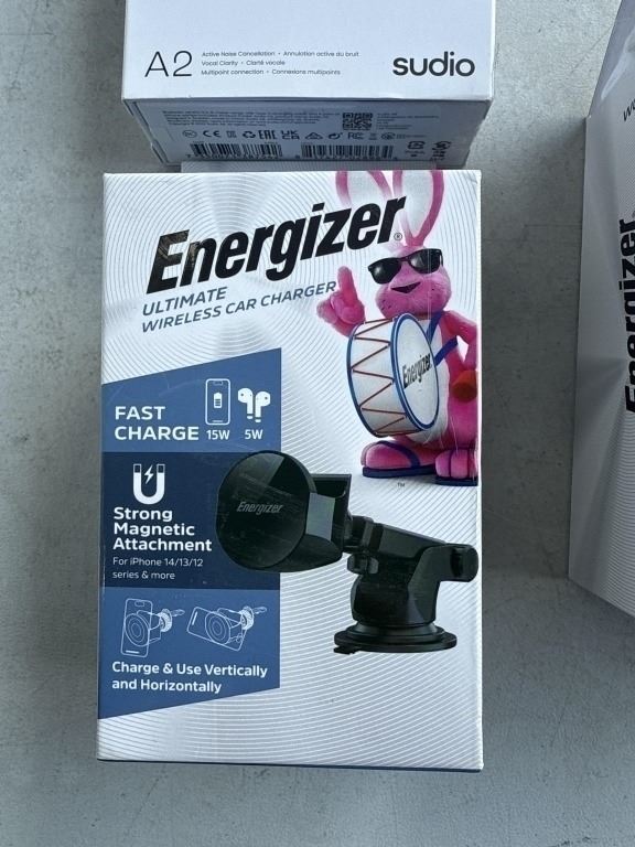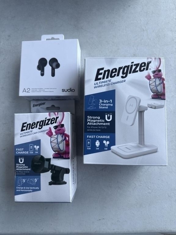 ENERGIZER ULTIMATE FAST CHARGE WIRELESS 3 IN 1 CHARGING STAND, ENERGIZER ULTIMATE WIRELESS CAR CHARGER, AND SUDIO A2 BLUETOOTH WIRELESS EARBUDS