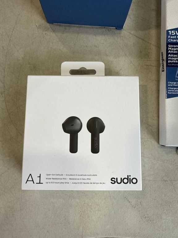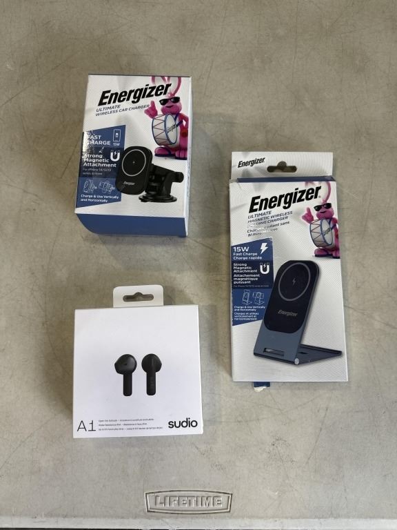 ENERGIZER ULTIMATE MAGNETIC WIRELESS FOLDING CHARGER, ENERGIZER ULTIMATE WIRELESS CAR CHARGER AND SUDIO A1 WIRELESS BLUETOOTH EARBUDS